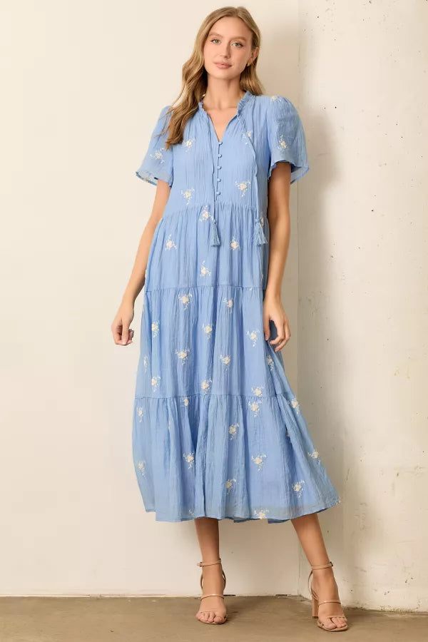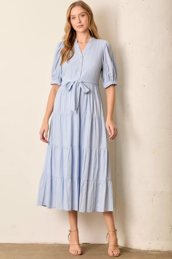 The Abby Button Front Tiered Midi Dress in Lt. Blue