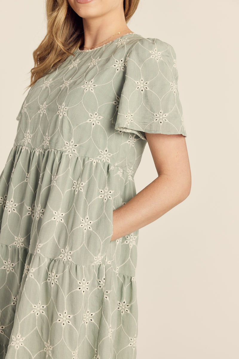 Elevate your everyday style with The Holly Tiered Dress in a serene sage hue. This midi dress features delicate ivory embroidery adorning the round neckline, and a darling embroidered pattern throughout the dress, complemented by short sleeves and a gracefully tiered skirt that adds movement and dimension. Practical pockets and a lined interior ensure comfort and functionality, the oversized fit makes this piece perfect for both casual outings and special occasions.