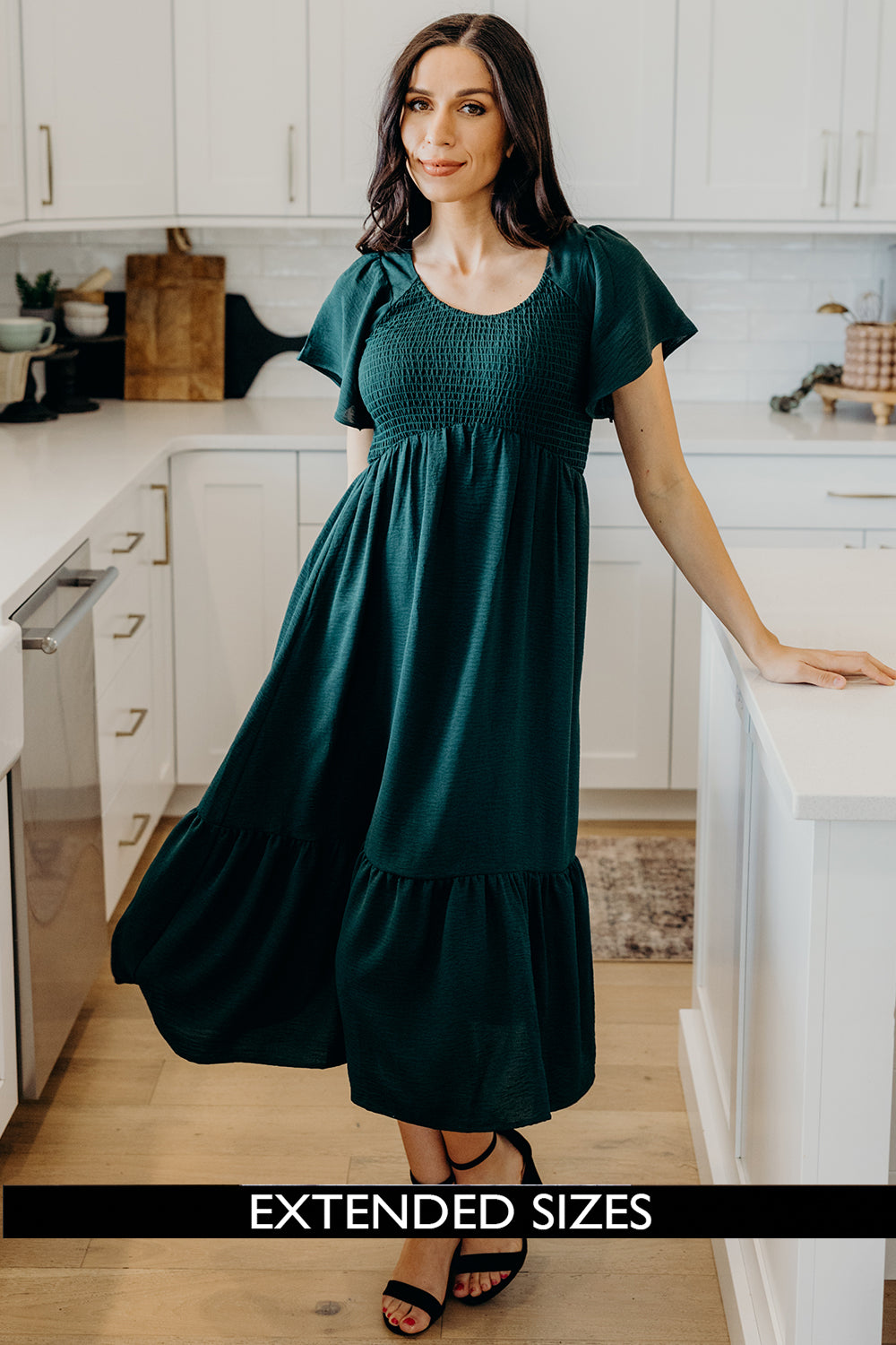 This expertly designed maxi dress will elevate your wardrobe with its stunning alpine green color. It has flowy sleeves and a flowy skirt to keep you feeling stunning all day long. It's ruching, pockets, keep you looking stunning. And last but not least, one final touch, the v-neck.