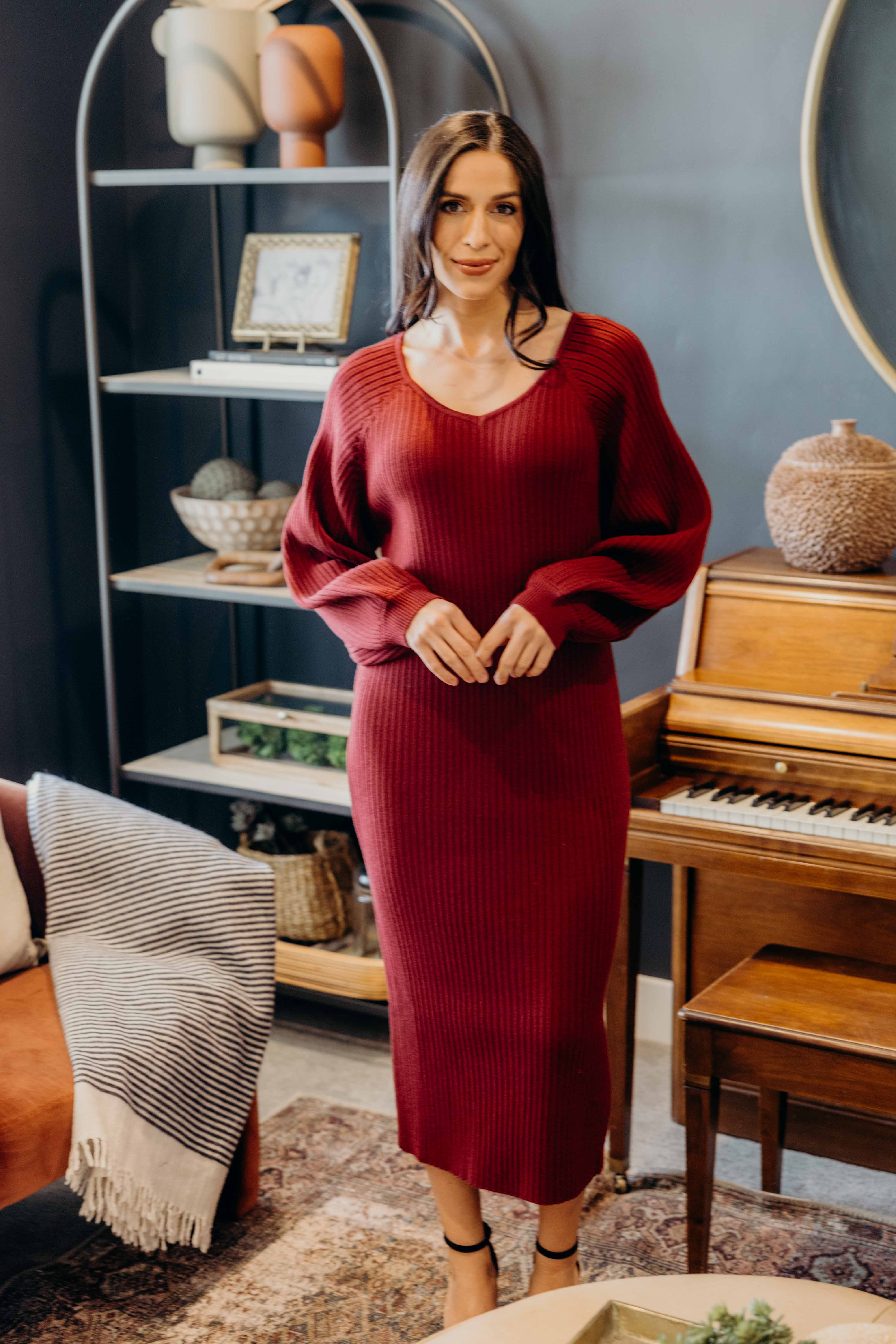 Get cozy in this rhubarb red ribbed sweater dress featuring a flirty v-neck, long oversized sleeves, and a comfy midi length that's perfect for all-day wear.