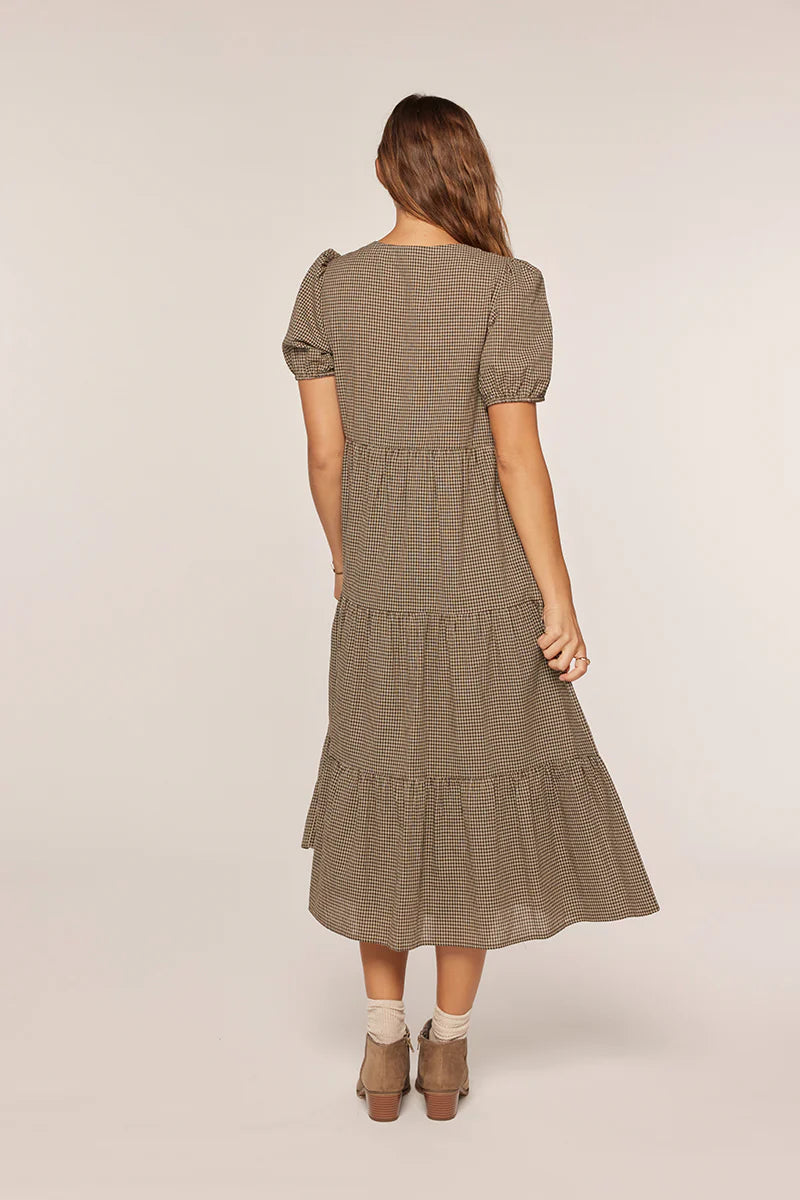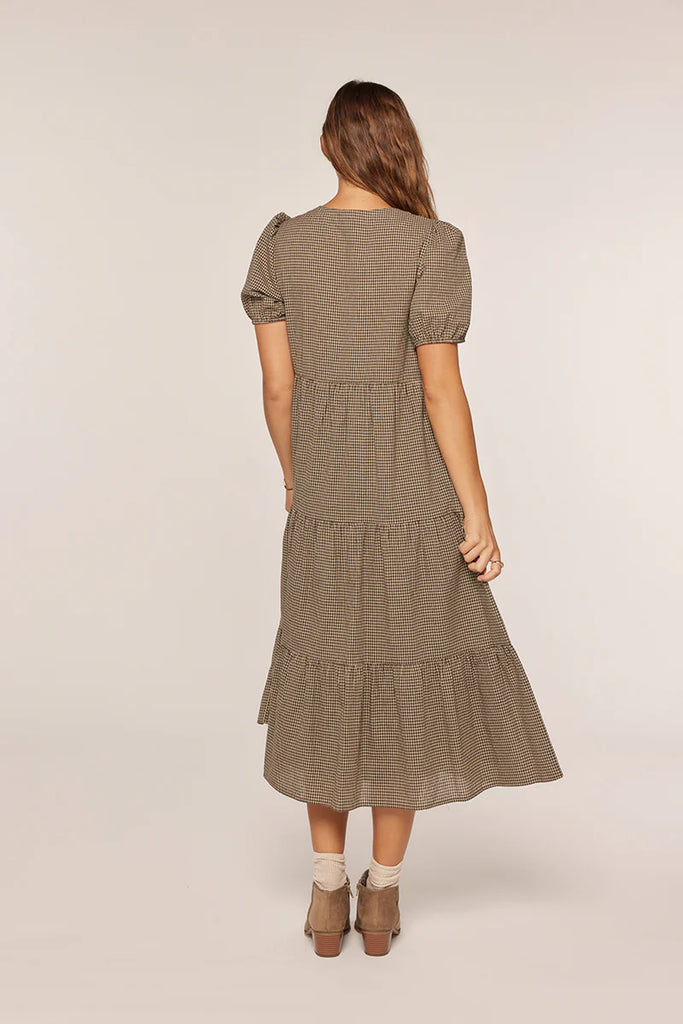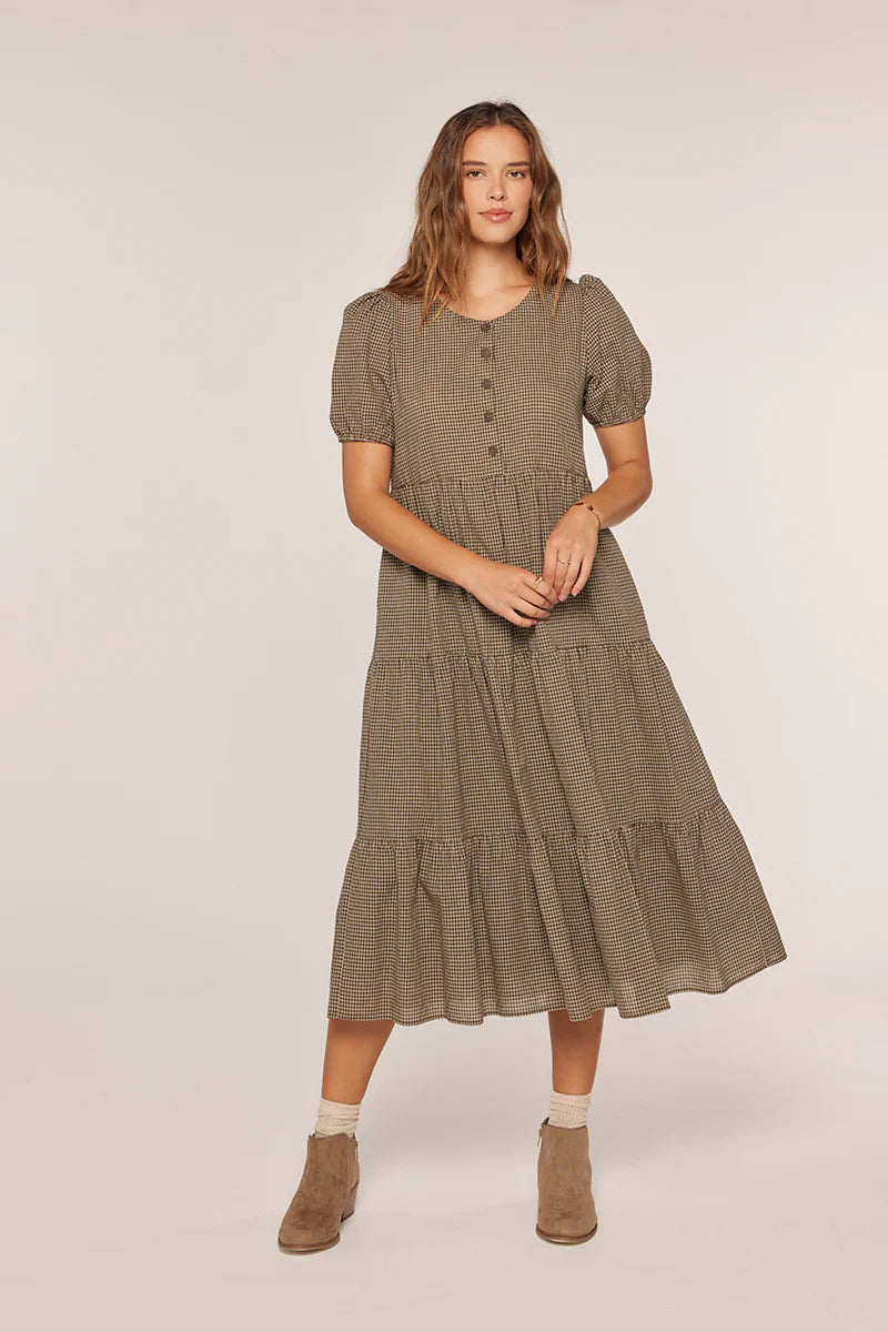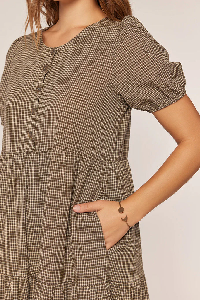 This playful olive gingham dress features short sleeves, a round neckline, button-down front, tiered skirt, handy pockets, and a comfortable lining for all-day wear.