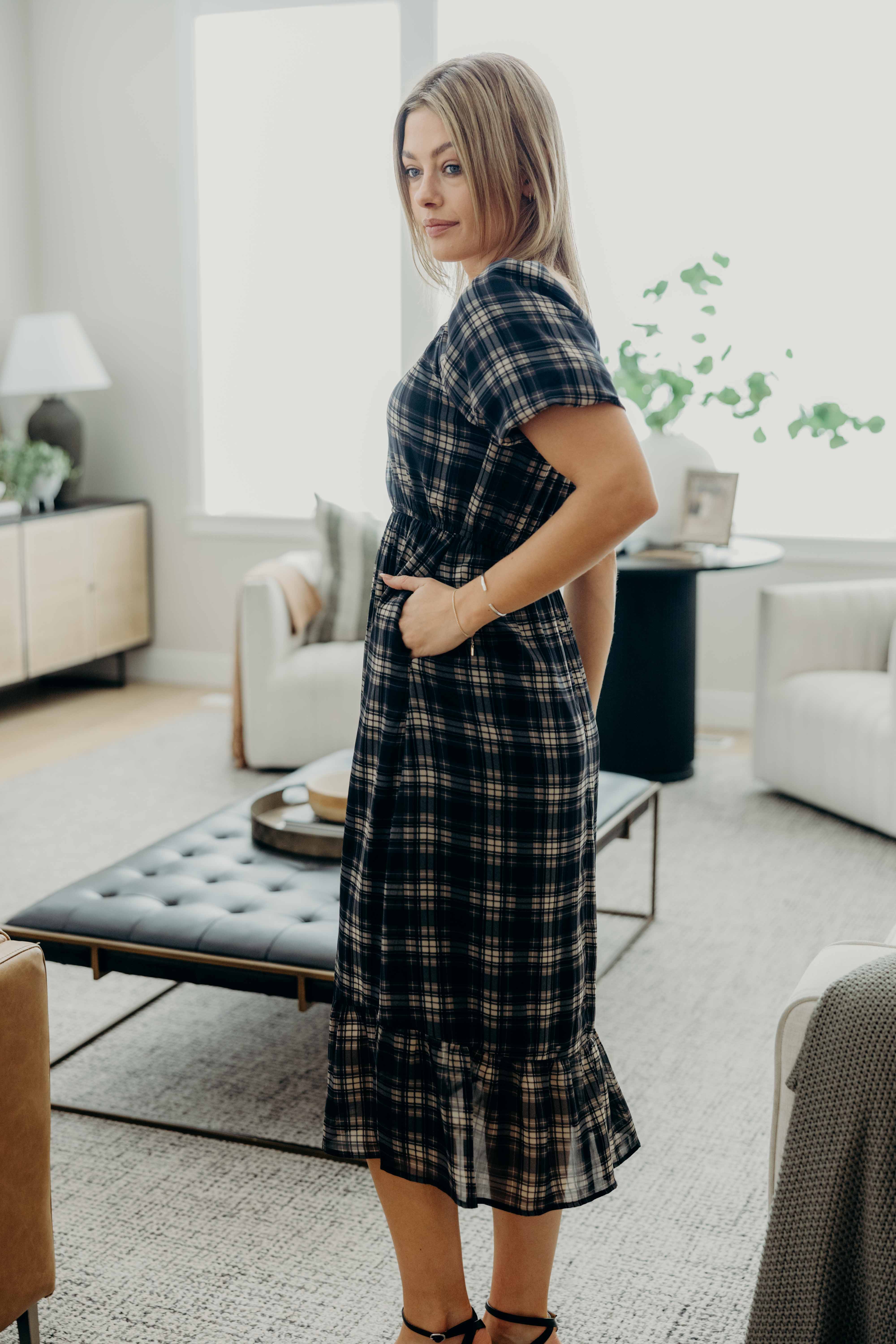 This indigo grid midi dress features a fun black and brown plaid pattern, short sleeves, and a round neckline. With an elastic waistline, a tiered skirt, and handy pockets, it's fully lined for extra comfort and ready to brighten your day!