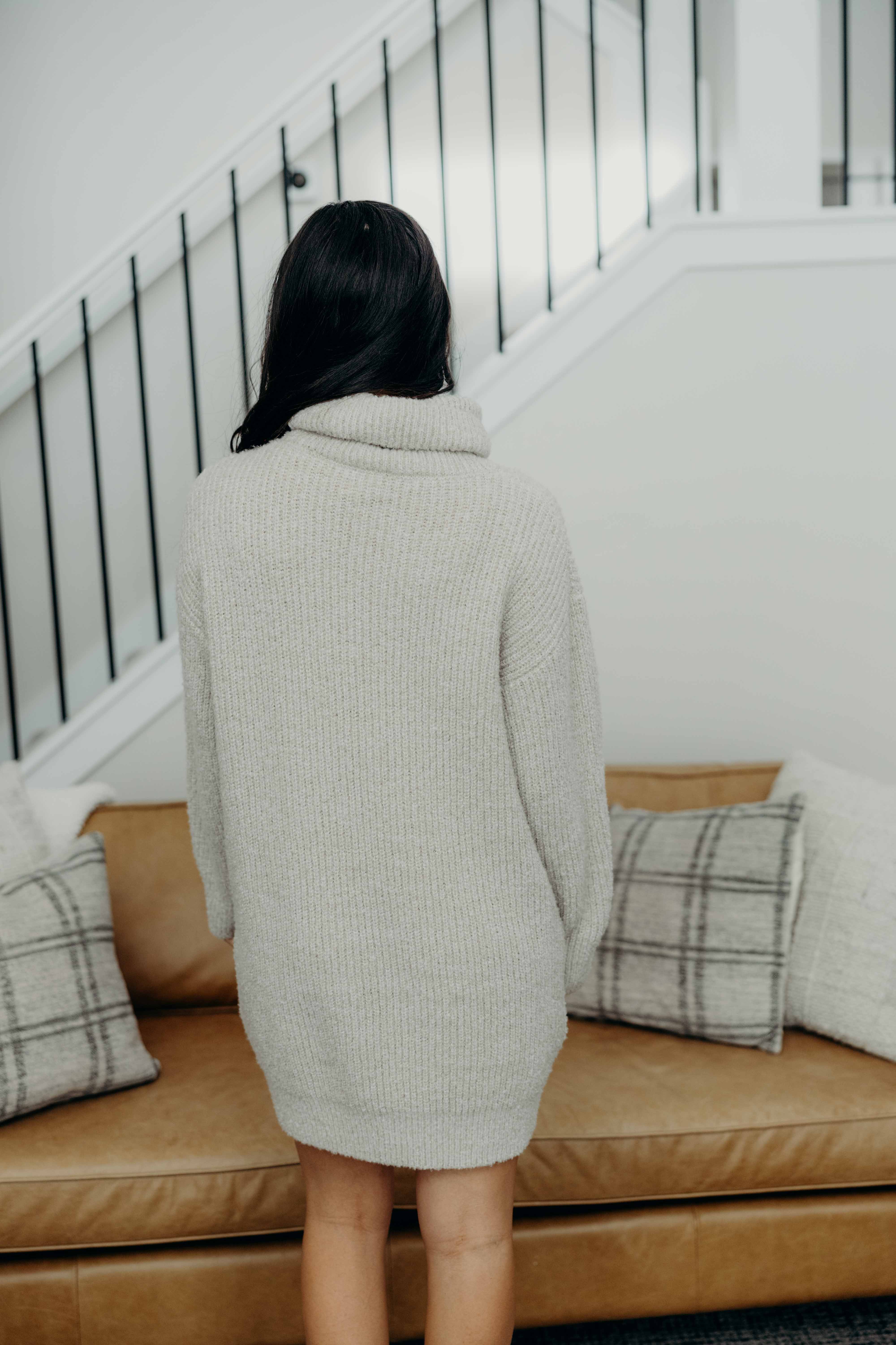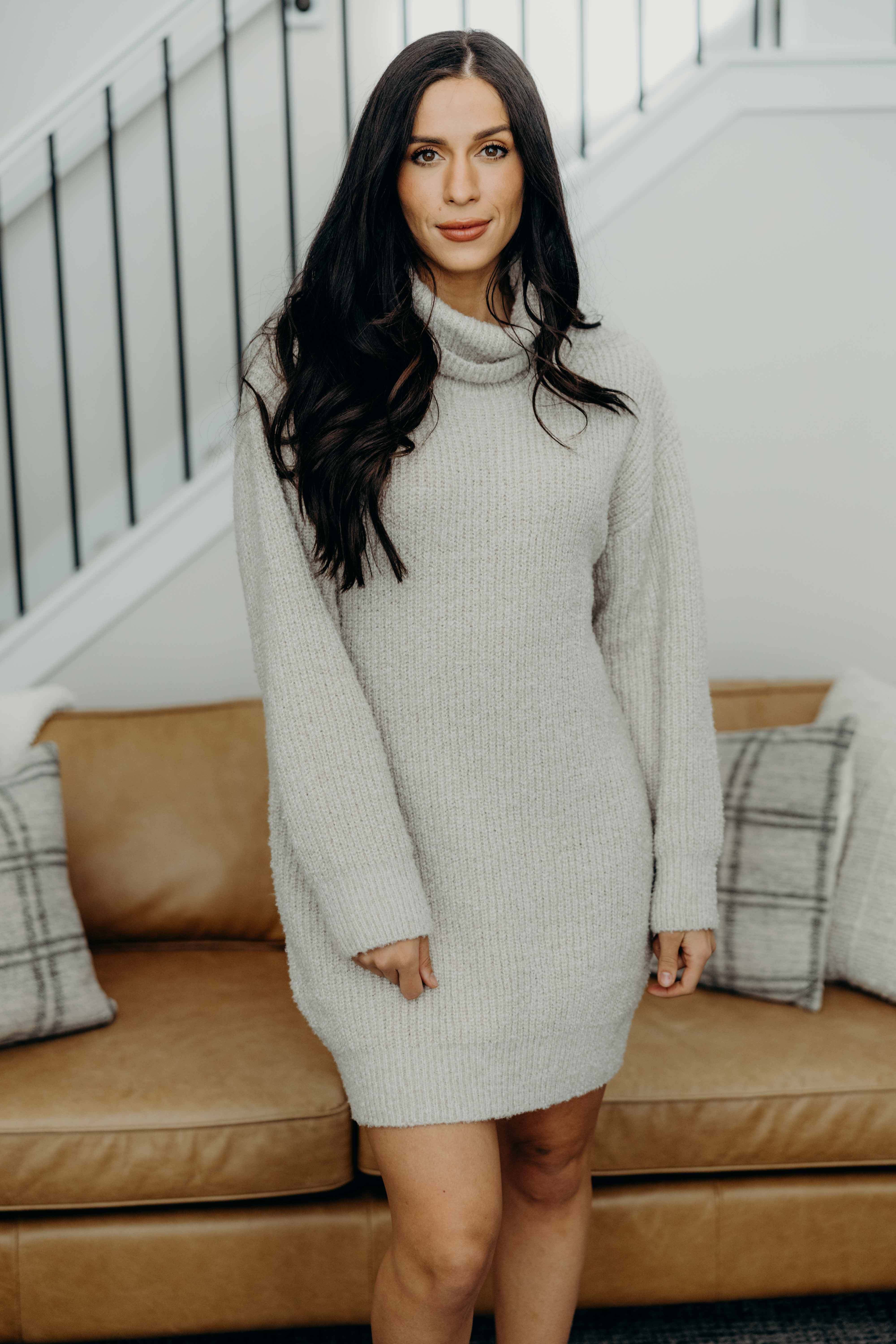 This oatmeal-colored sweater dress features a loose turtleneck and long sleeves, perfect for cozy days. Thick and warm, it pairs perfectly with your favorite leggings for a playful, comfy look!