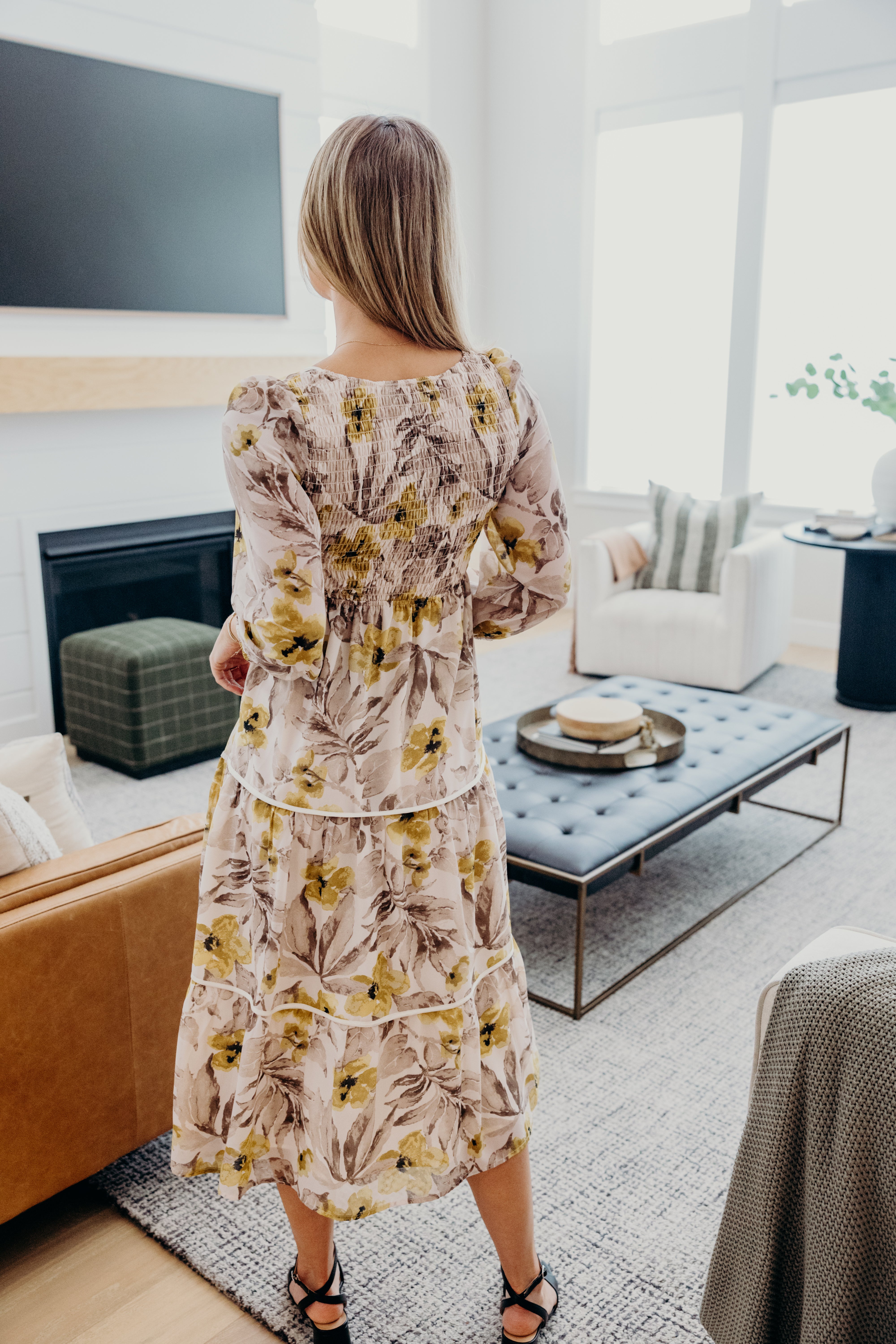This lovely tiered dress showcases big brown and yellow florals, featuring fabric-covered buttons down the front, long sleeves, a square neckline, and a smocked back for a comfy fit, with a lined skirt and bodice