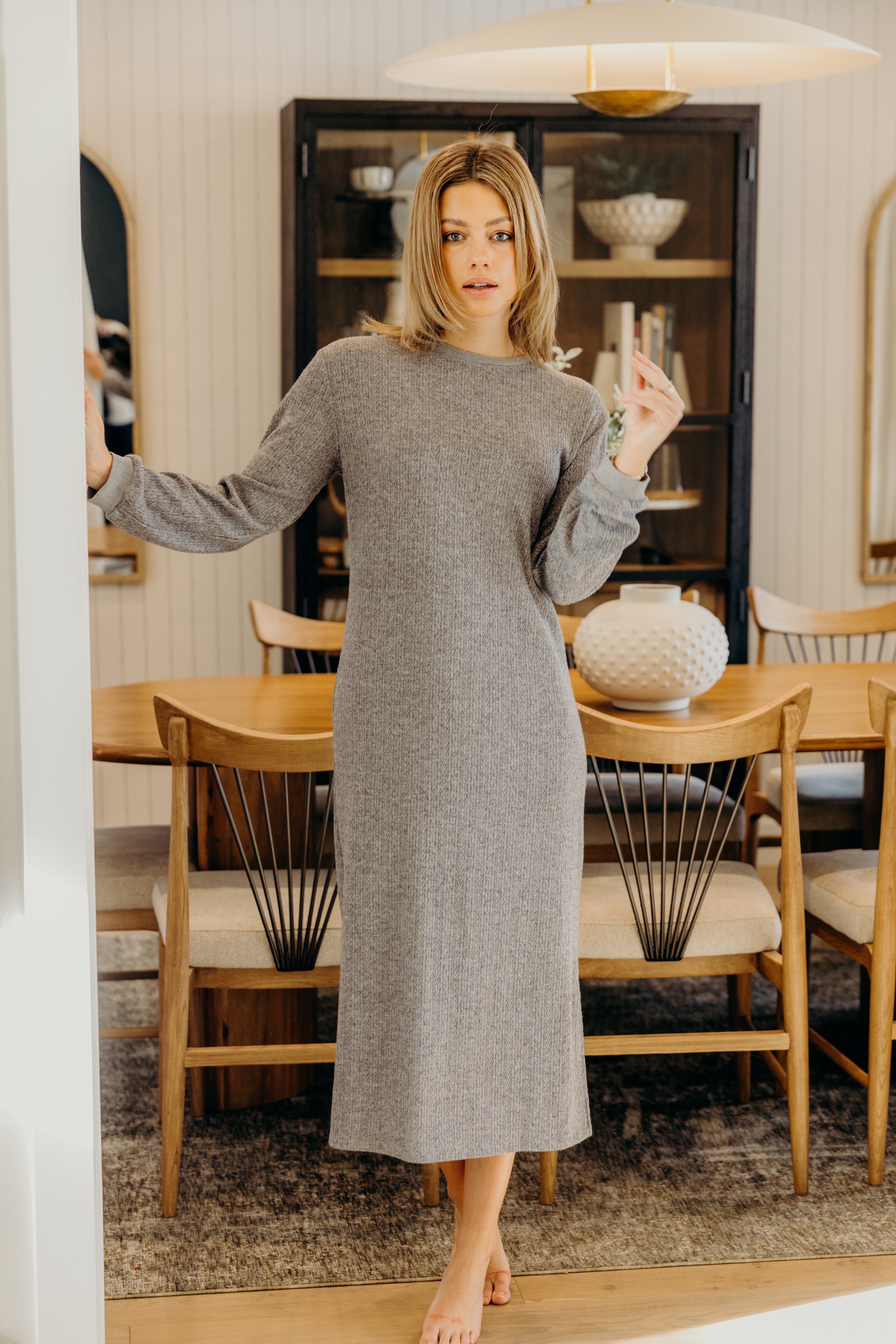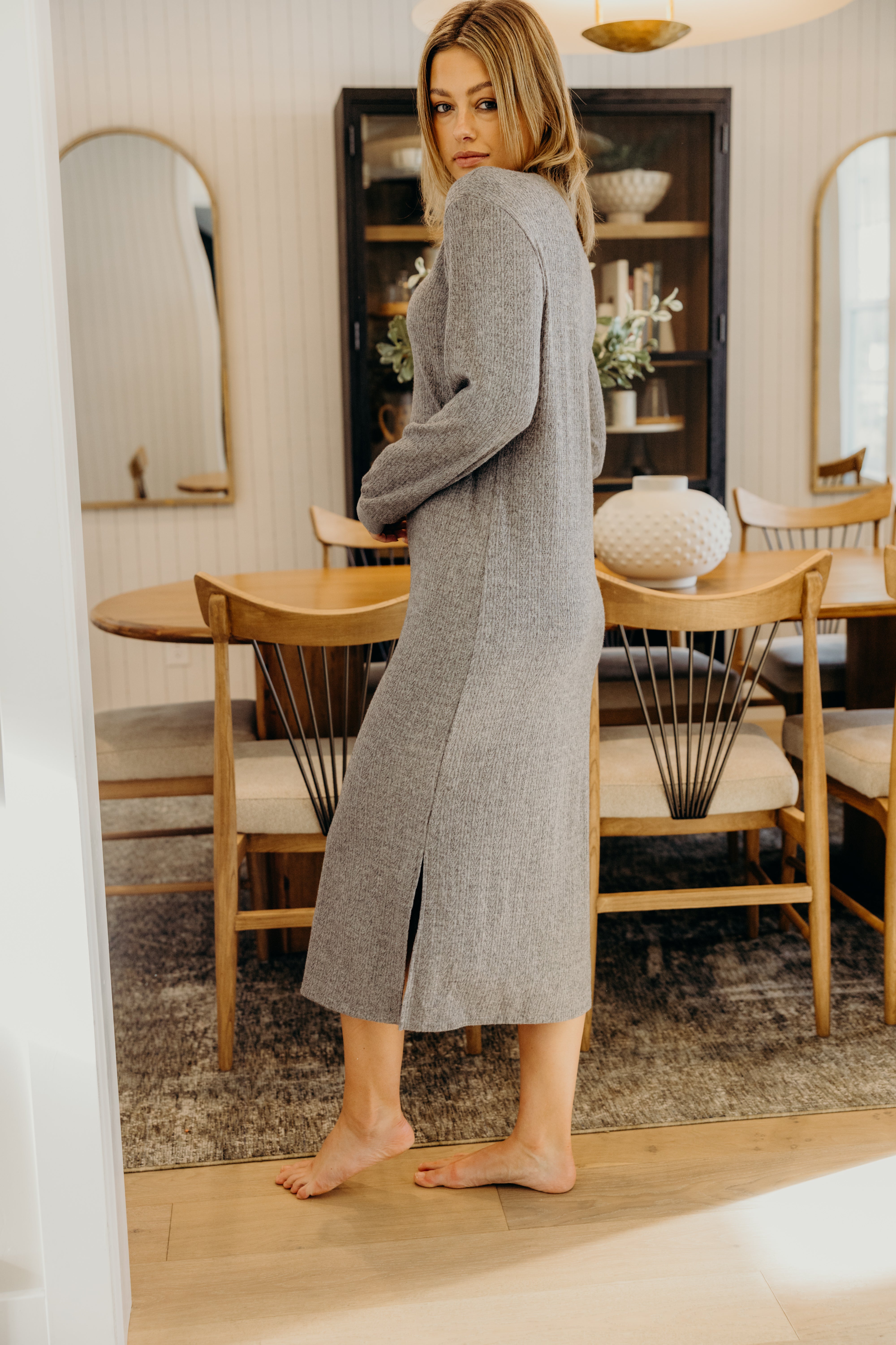 This playful oversized maxi sweater dress in speckled gray features long sleeves and a flirty side slit for effortless style and comfort.
