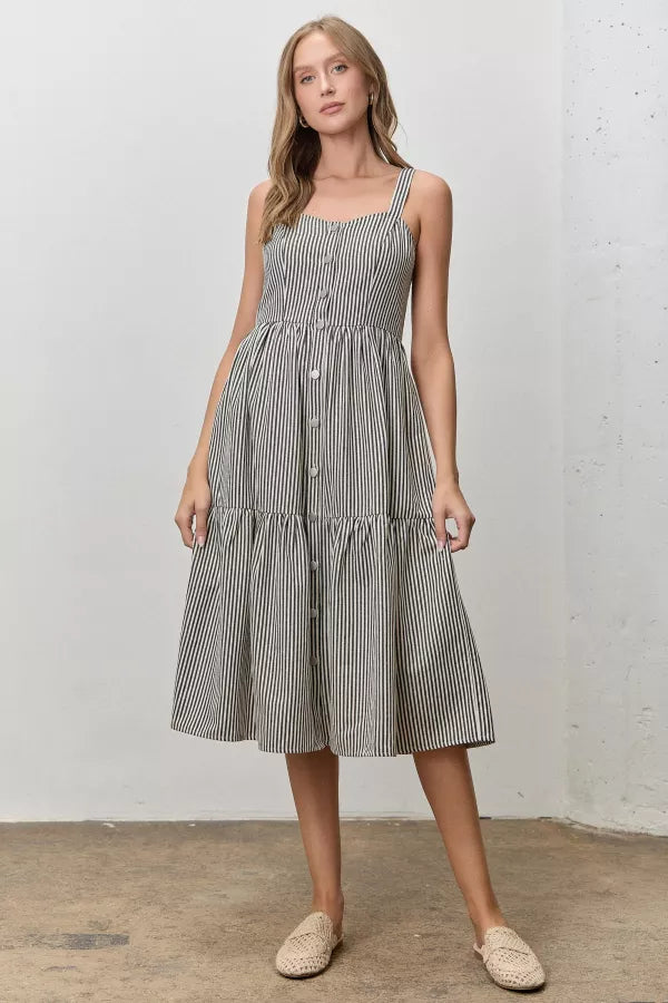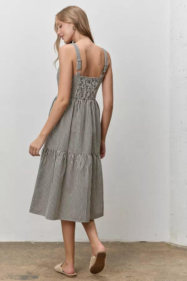 Stripes meet sophistication in this charming midi overall dress that's equal parts fun and functional. Featuring classic black and white stripes, adjustable shoulder straps, and a flattering smocked back, this dress delivers effortless style. Silver button details line the front, while a tiered skirt adds movement and dimension. Best of all? Practical pockets keep your essentials close. Perfect for casual outings or dressed-up occasions.
