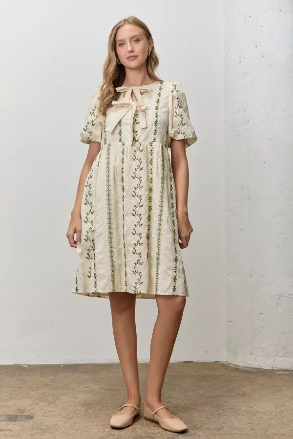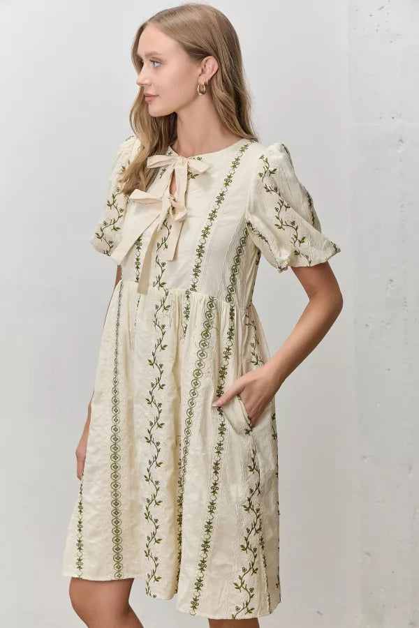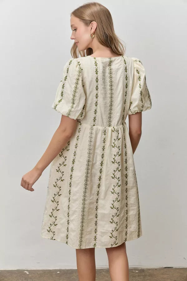 The Clarice Embroidered Dress in Cream/Green