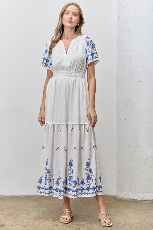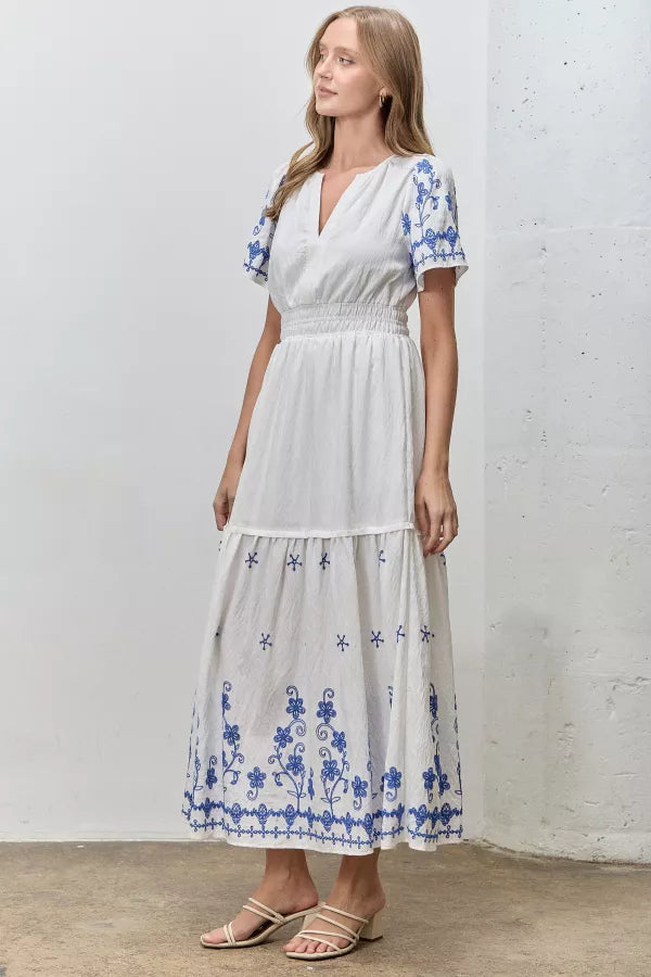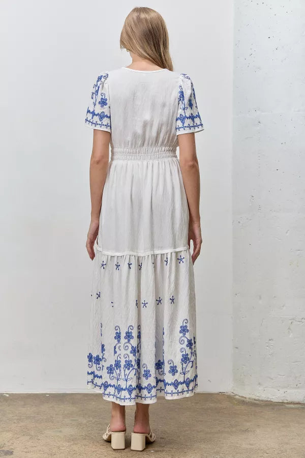 This beautifully embroidered dress is made with a woven fabric in cream featuring floral embroidered detailing in blue across the sleeves, and fronts of the skirt tiers. It has an open collar, short, wide sleeves, an elastic waist, and a lined, full, maxi-length, tiered skirt with inseam skirt pockets!