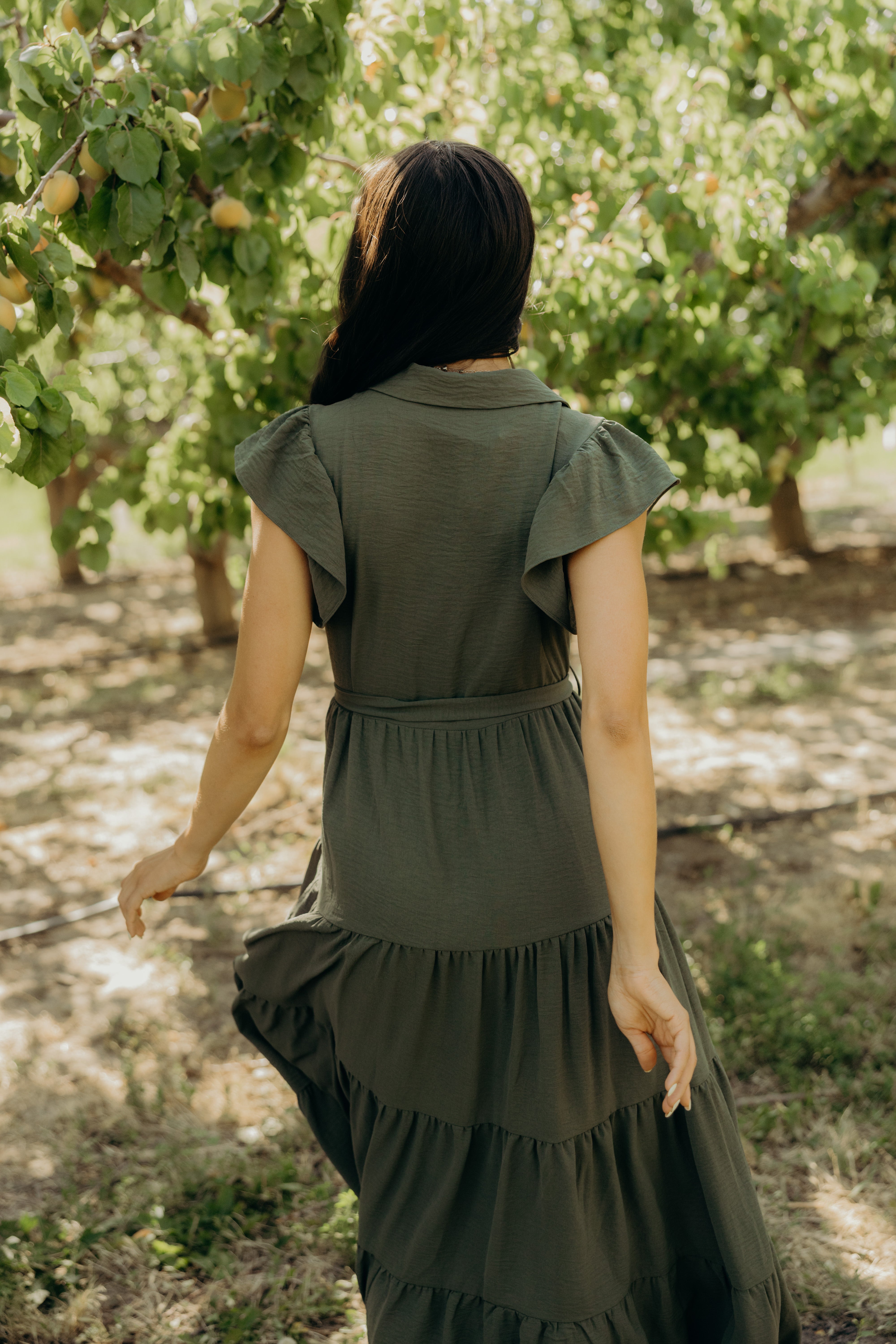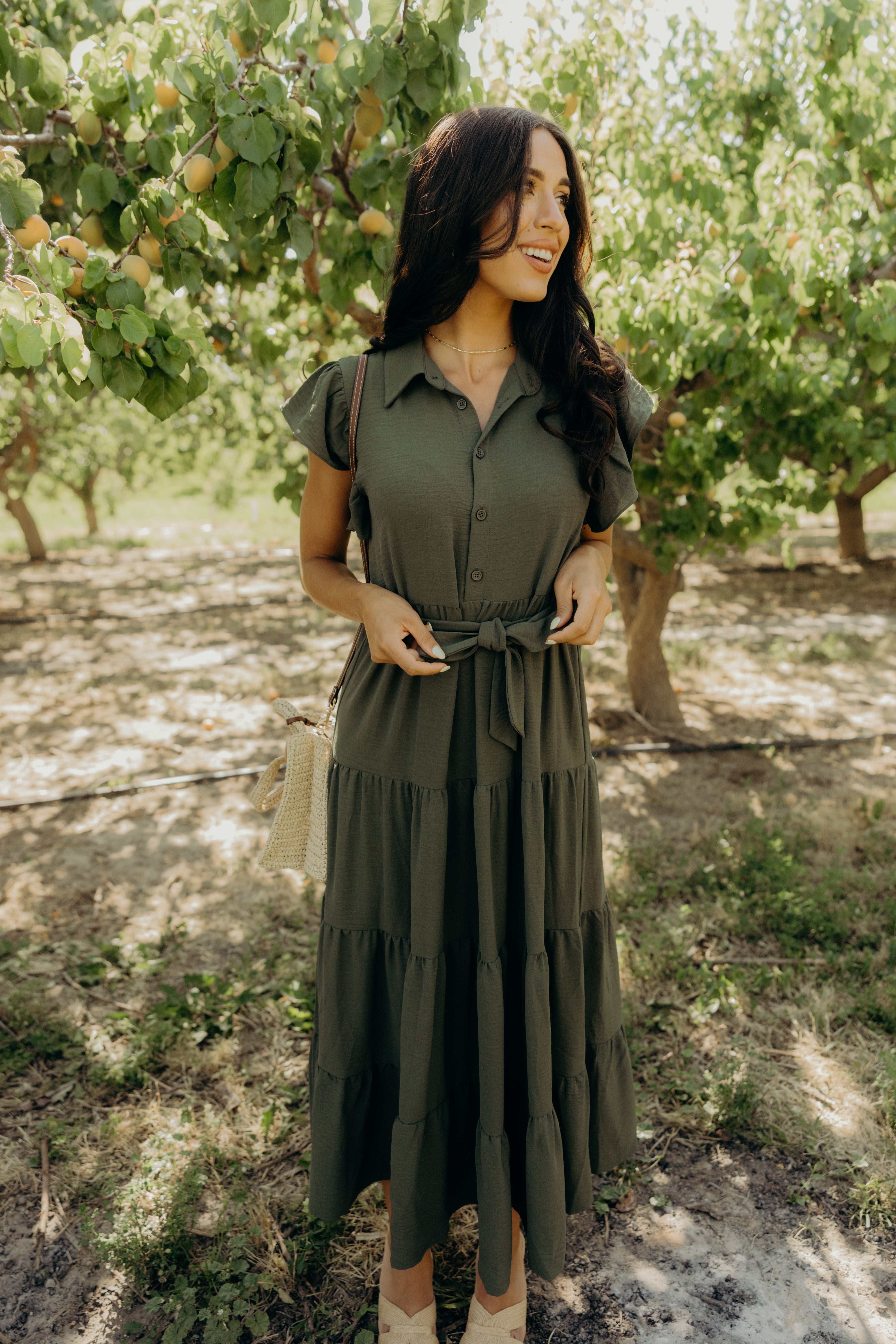 Slip into the enchanting Goldie Dress in Olive Green, a charming dress featuring flirty ruffle sleeves and a classic collar. With its playful button-down front, flattering waist tie, and bouncy tiered design, this beauty is ready for whatever adventures your day holds!