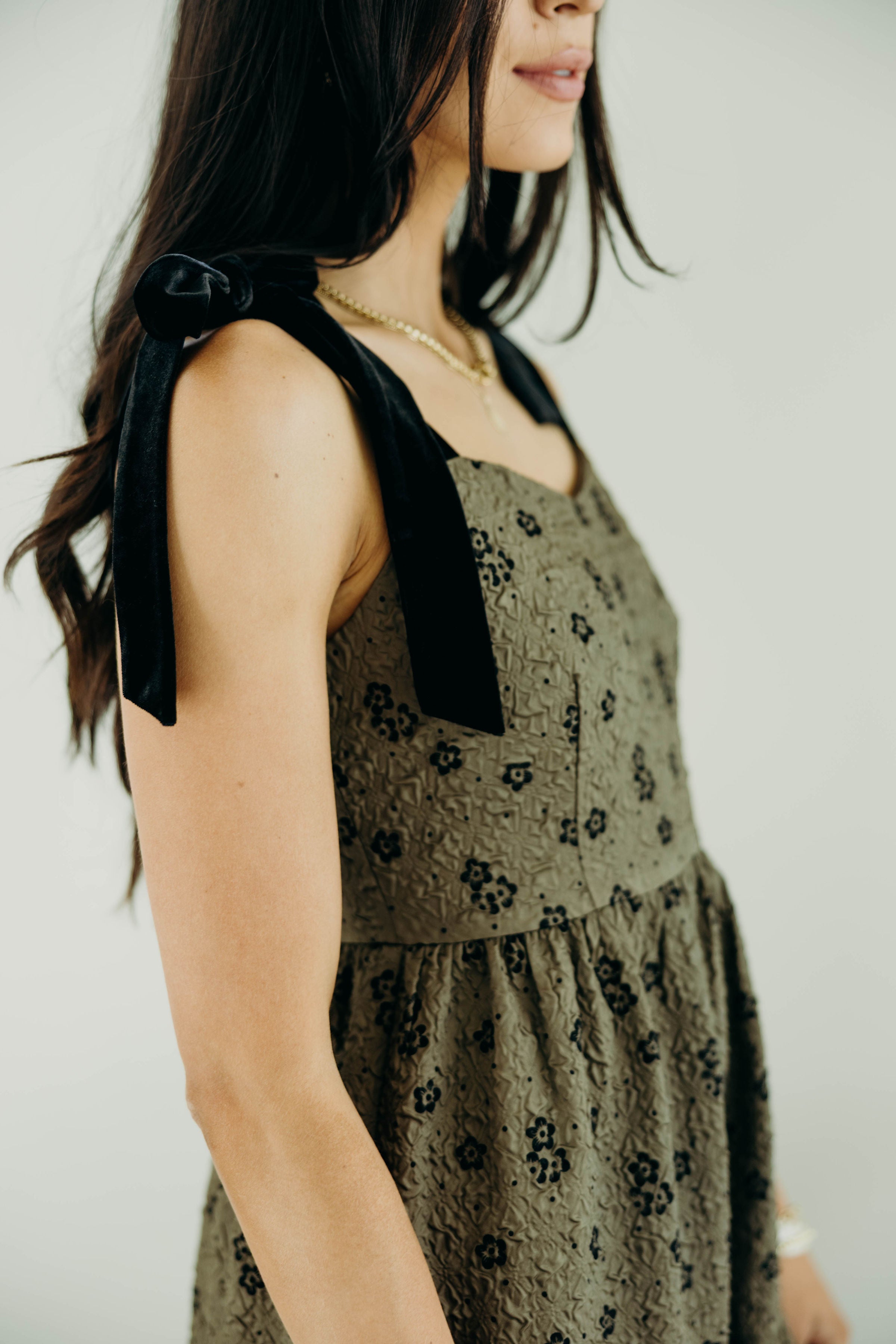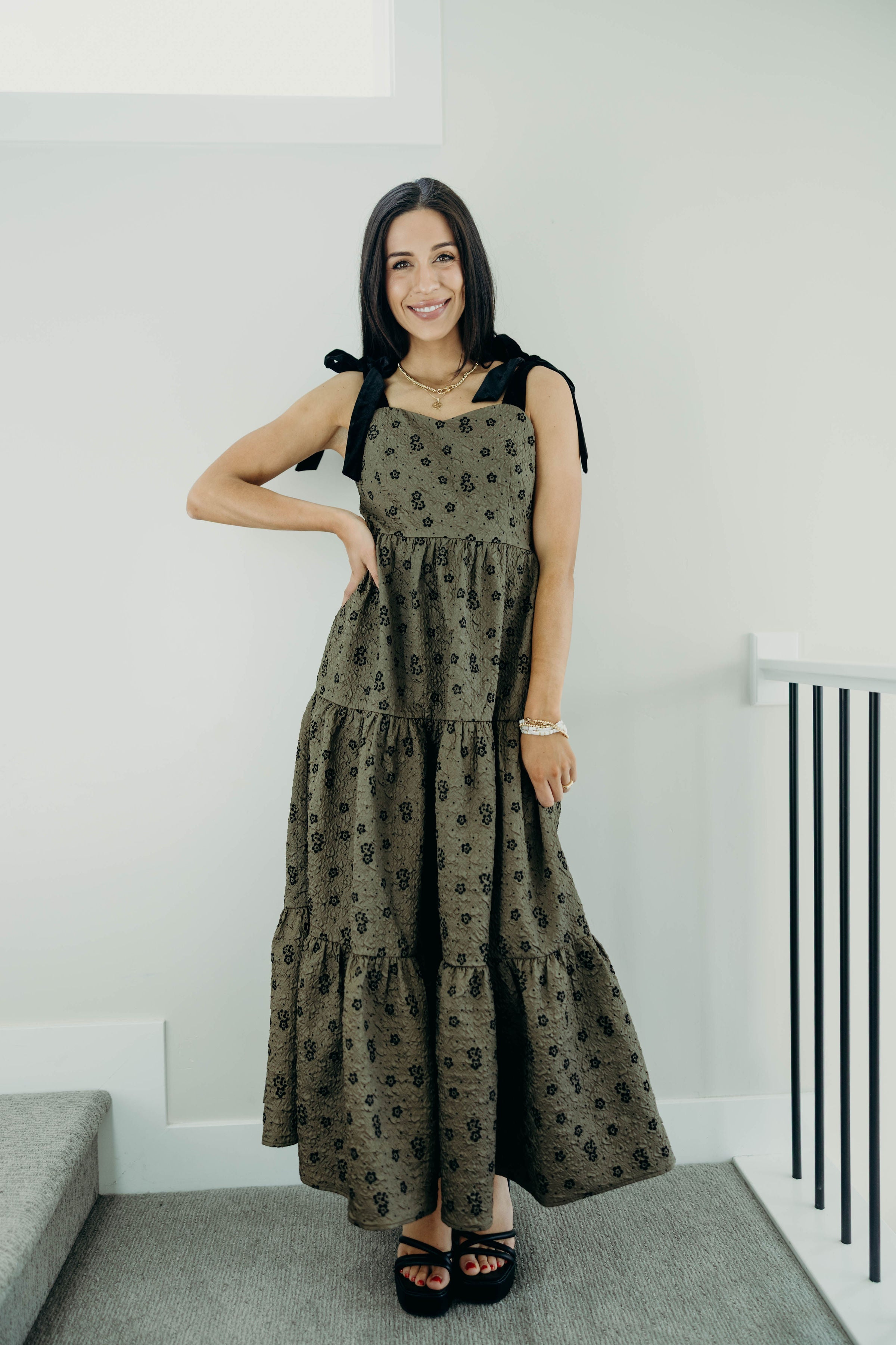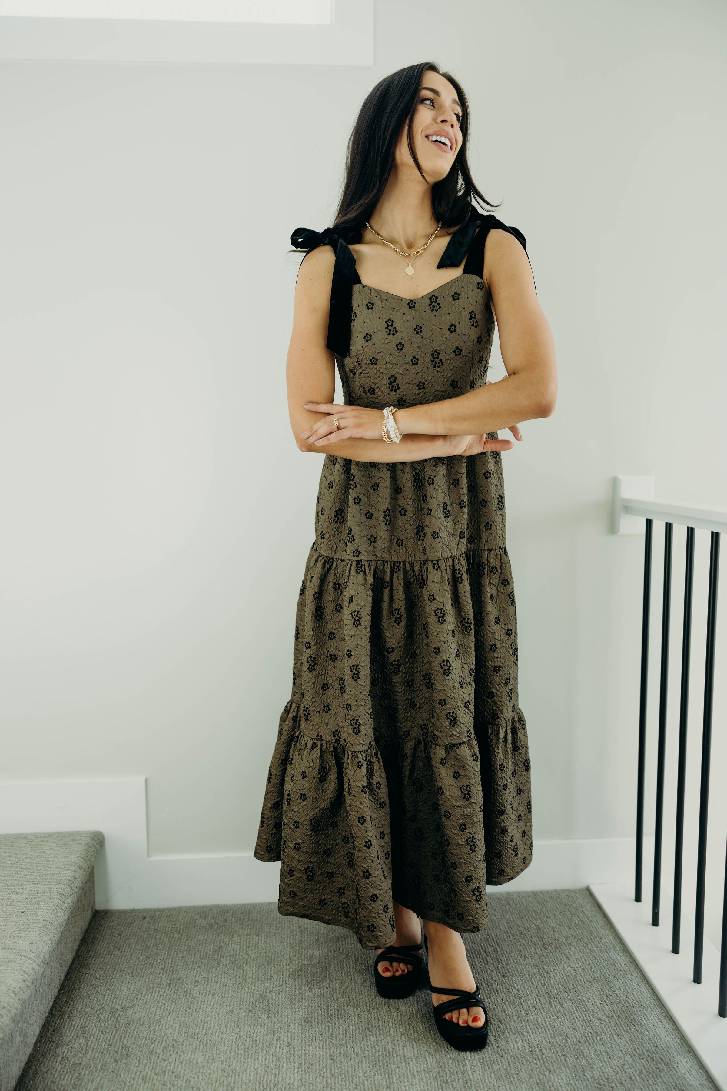 This jumper dress in brown with a black floral pattern features black velvet shoulder ties, a tiered maxi skirt, and a back zipper for a formal yet fun look.