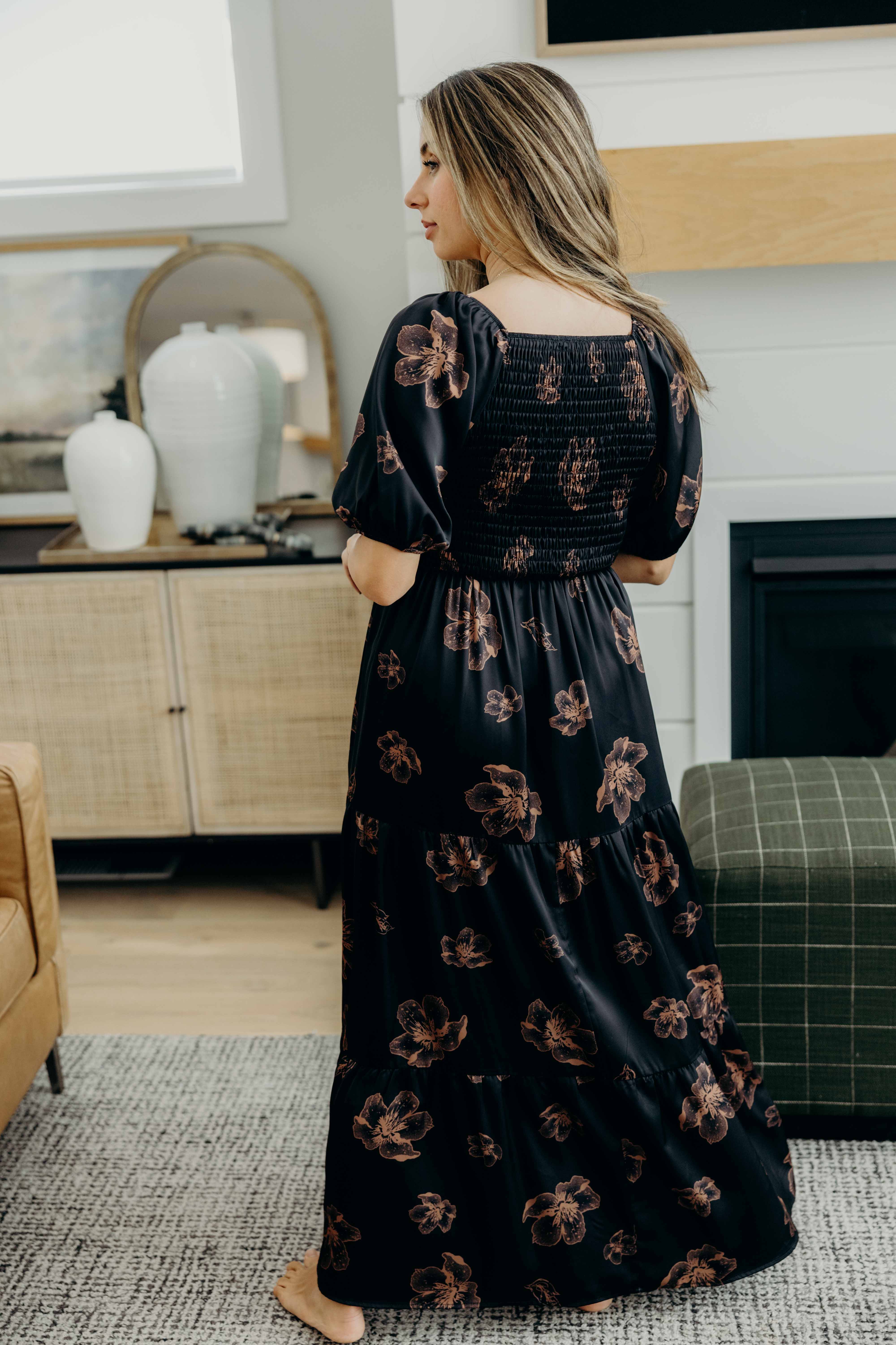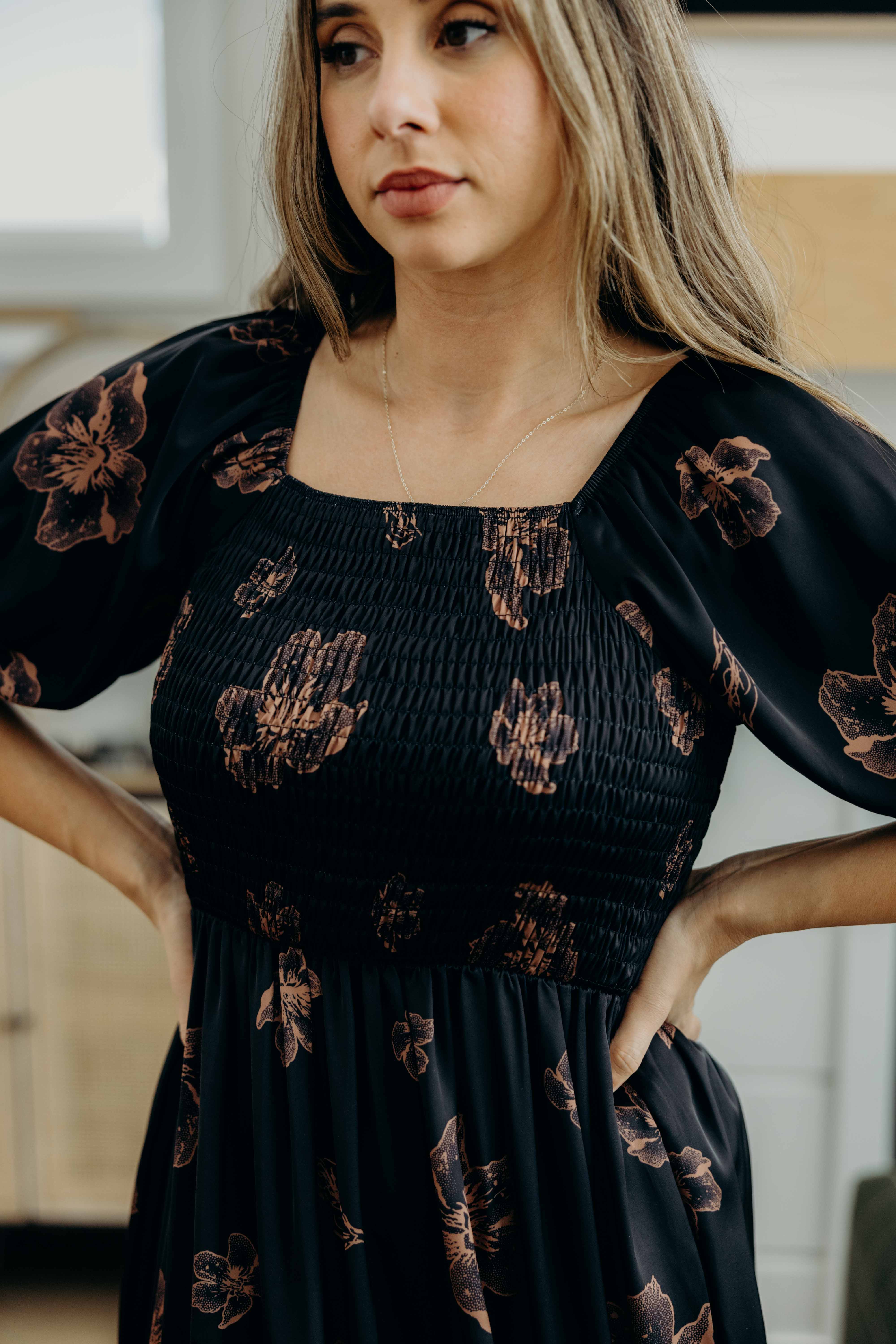 Stand out in our Indigo Maxi Dress! This black dress features a brown floral pattern with functional pockets for convenience, ruching for a flattering fit, and an elastic neckline for comfort. With puff sleeves and a tiered double lining, this bold dress will make you feel yourself.
