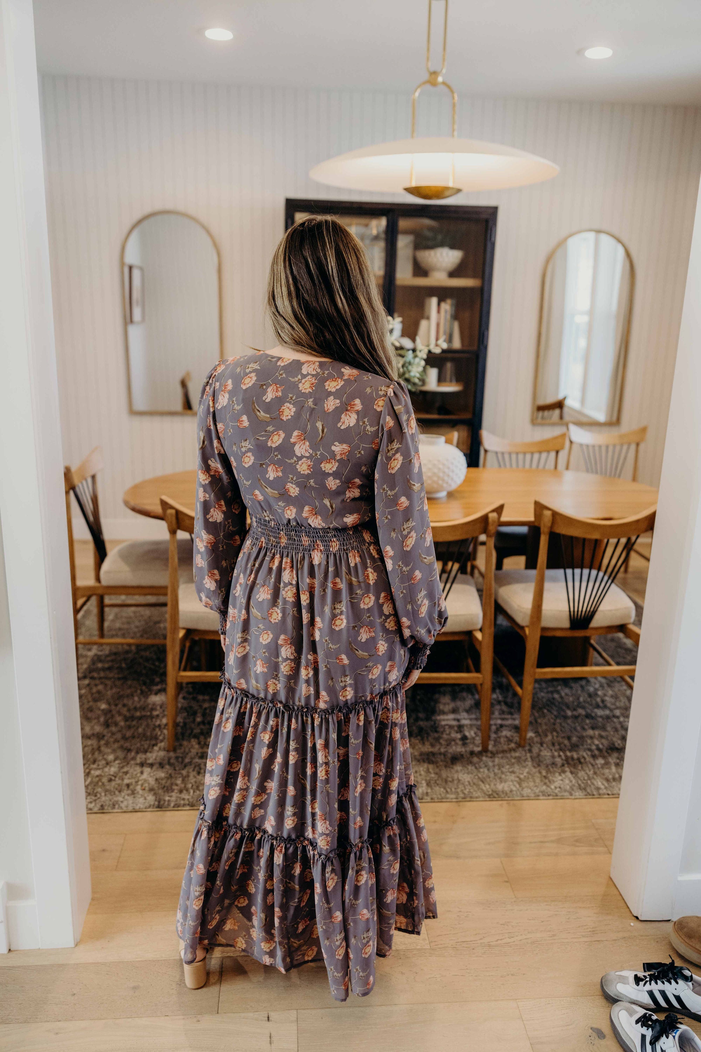 This, oh so cute, maxi dress is made with a woven gray fabric with a pink and green floral print and is fully lined (including the sleeves). It also features long sleeves, a v-neck, a shirred elastic waist, and a very long tiered skirt.