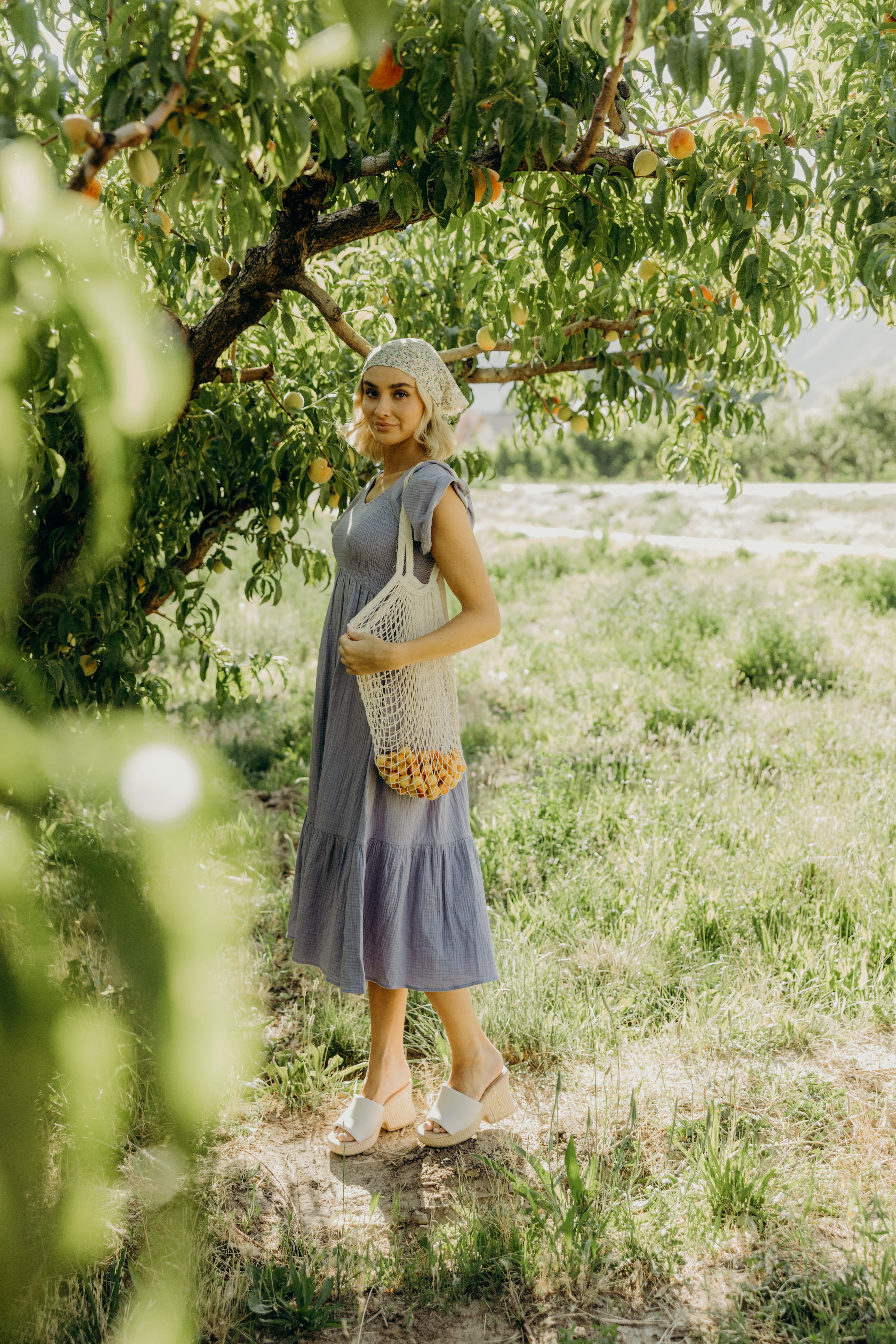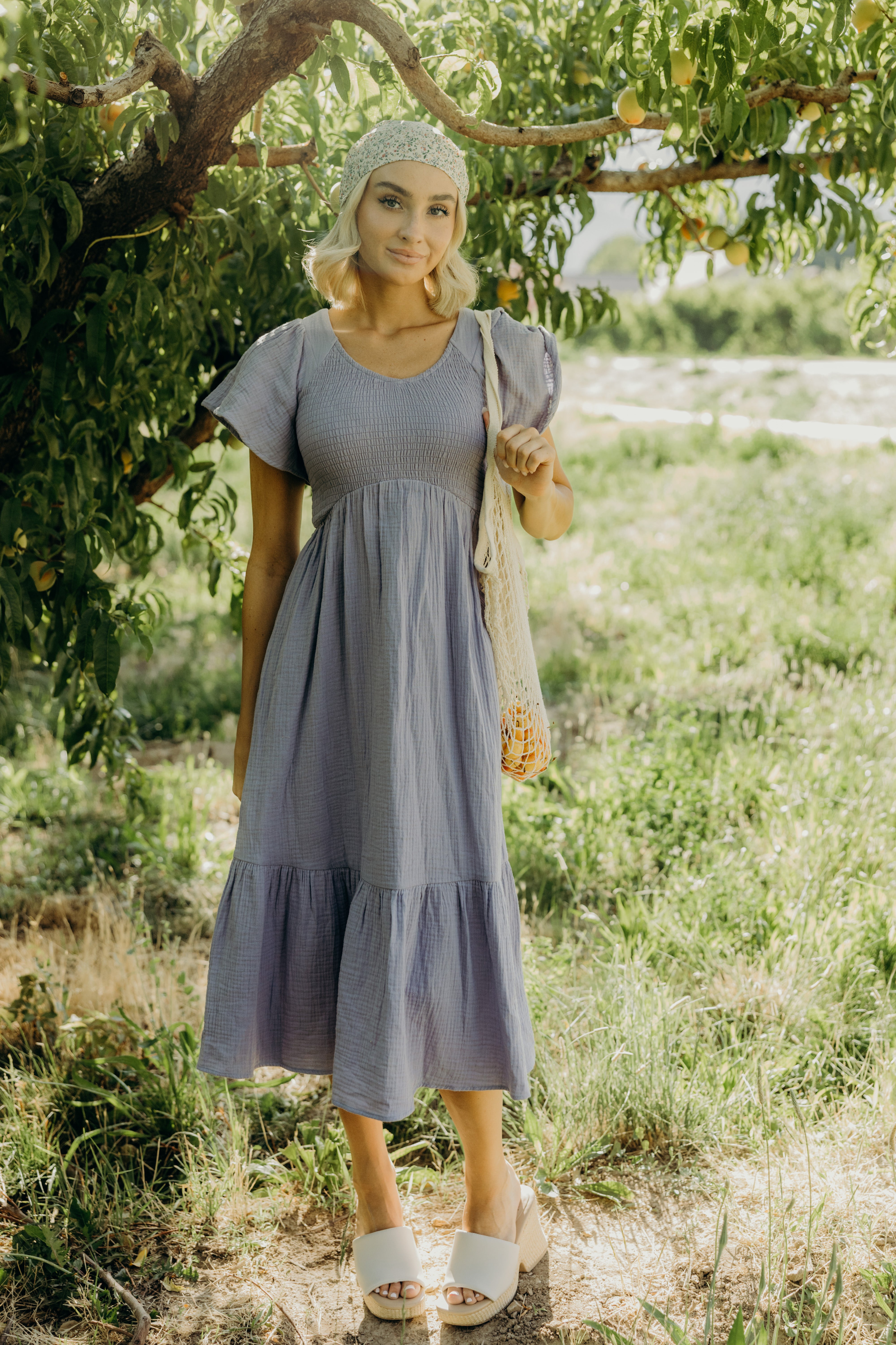 Twirl into enchantment with this charming midi dress featuring a flattering V-neckline and breezy short sleeves. Crafted from lightweight gauze, the cascading tiered skirt moves beautifully with every step, while hidden pockets keep your essentials close. The rich blue hue adds a touch of magic to any occasion, whether you're dressing up or keeping it casual.