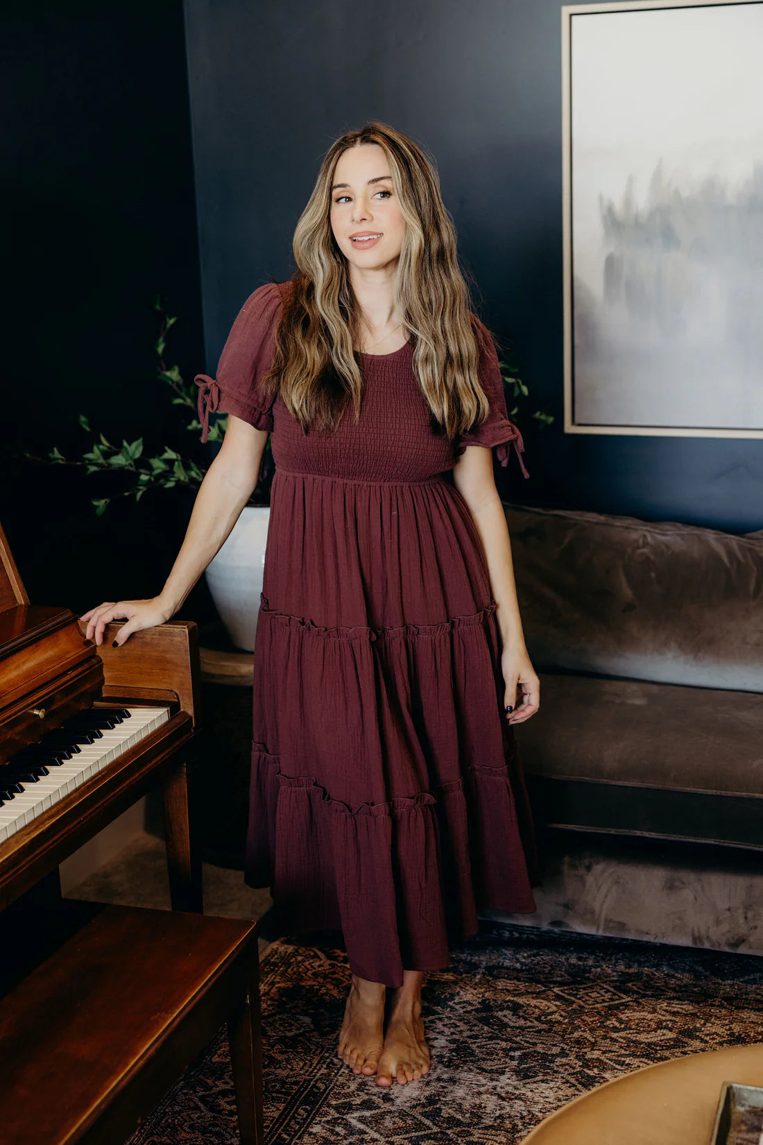 Step into this luminous dark maroon midi dress featuring a smocked bodice, airy cotton gauze fabric, playful short sleeves with ties at the ends, a round neckline, tiered layers, and a comfy lining.