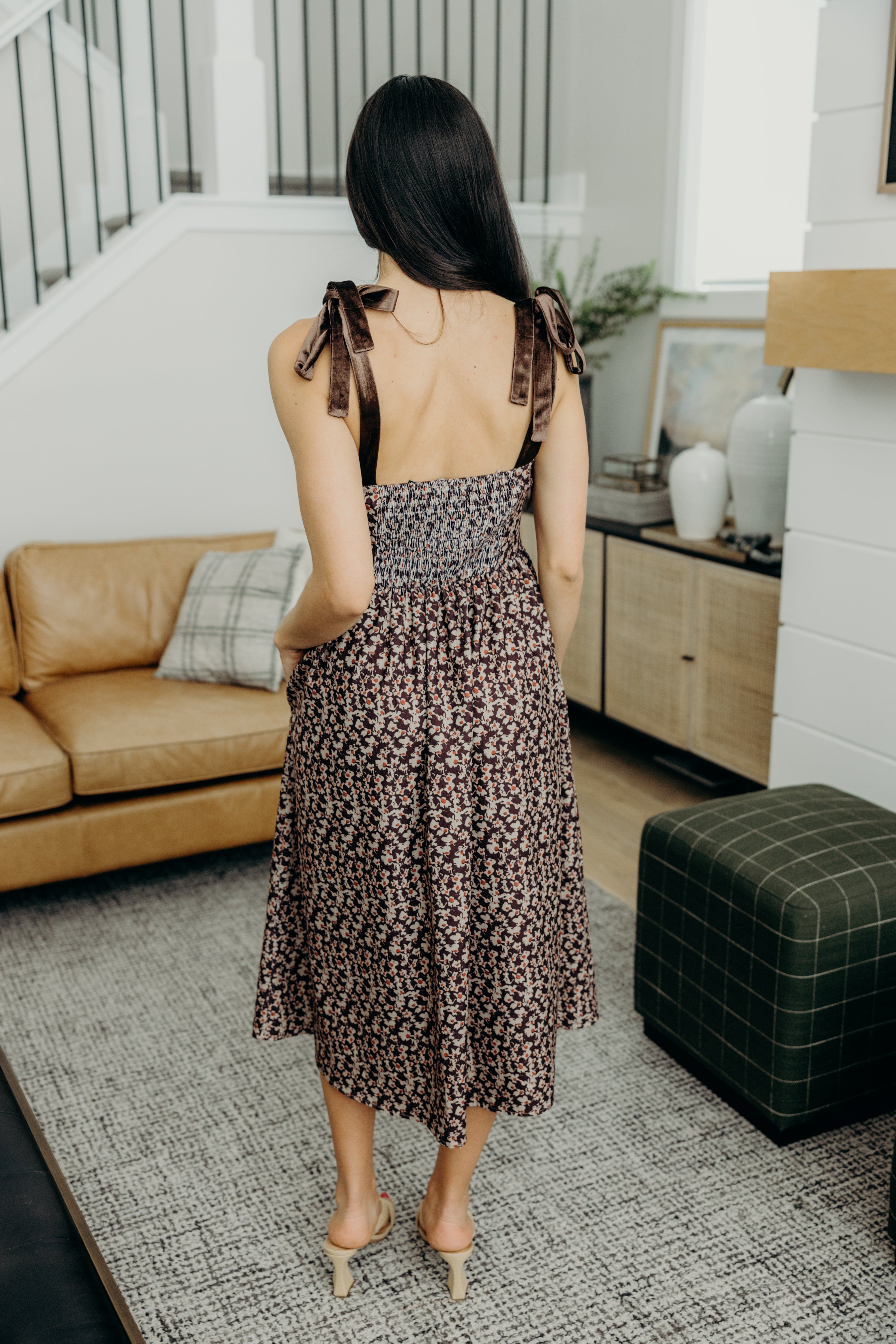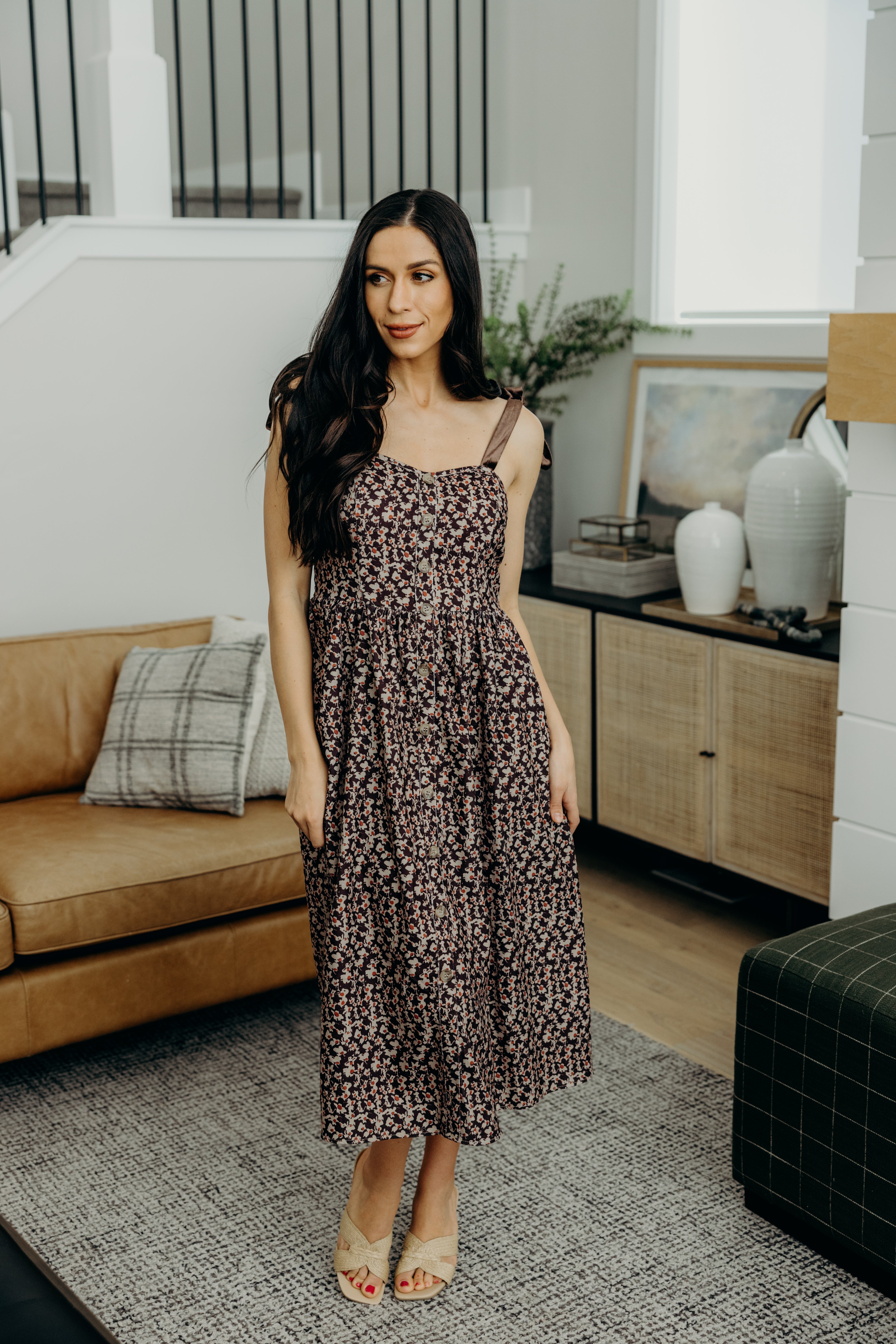 This brown floral jumper charms with velvet shoulder ties, a faux button-down front, and convenient pockets to keep your essentials close.