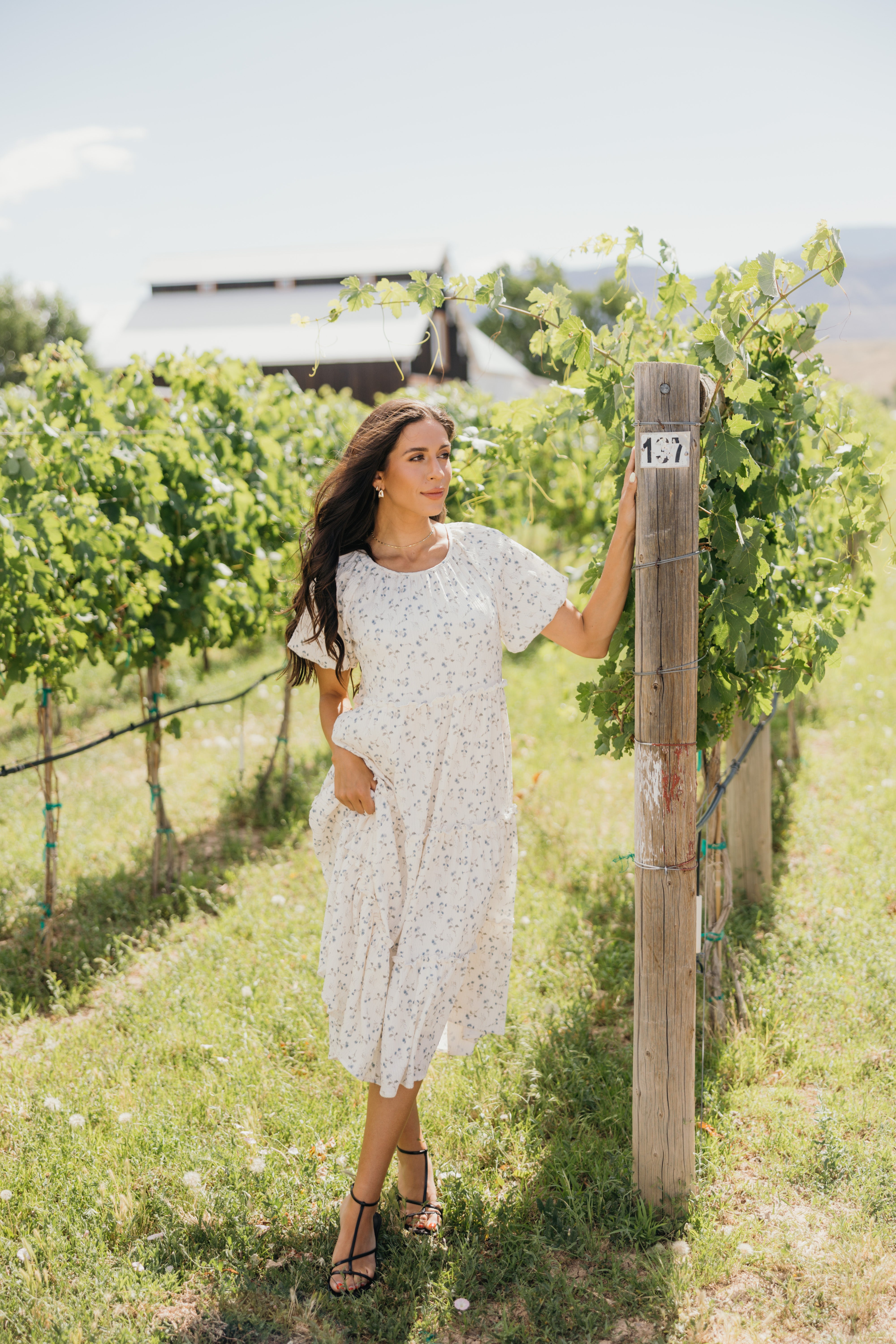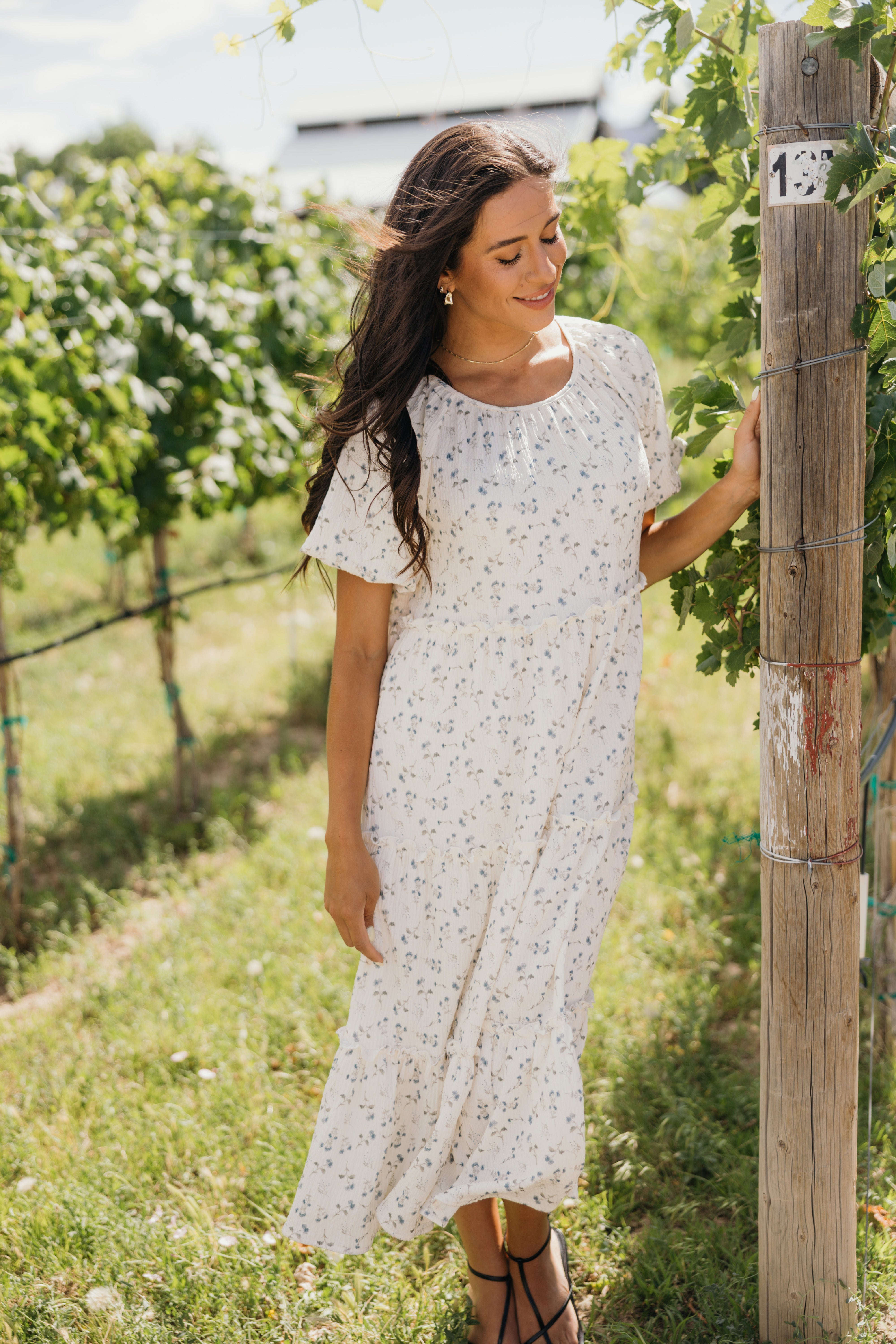 This fantastic dress is made with a woven cream fabric and features a darling blue and brown floral pattern It also has a round neckline, short exaggeratedly puffed sleeves, a relaxed waist with a tiered shape with small ruffle bordering along the tops of the tiers, and an ankle length.