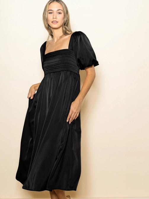 The Bianca Ruching Pleated Dull Satin Dress in Black