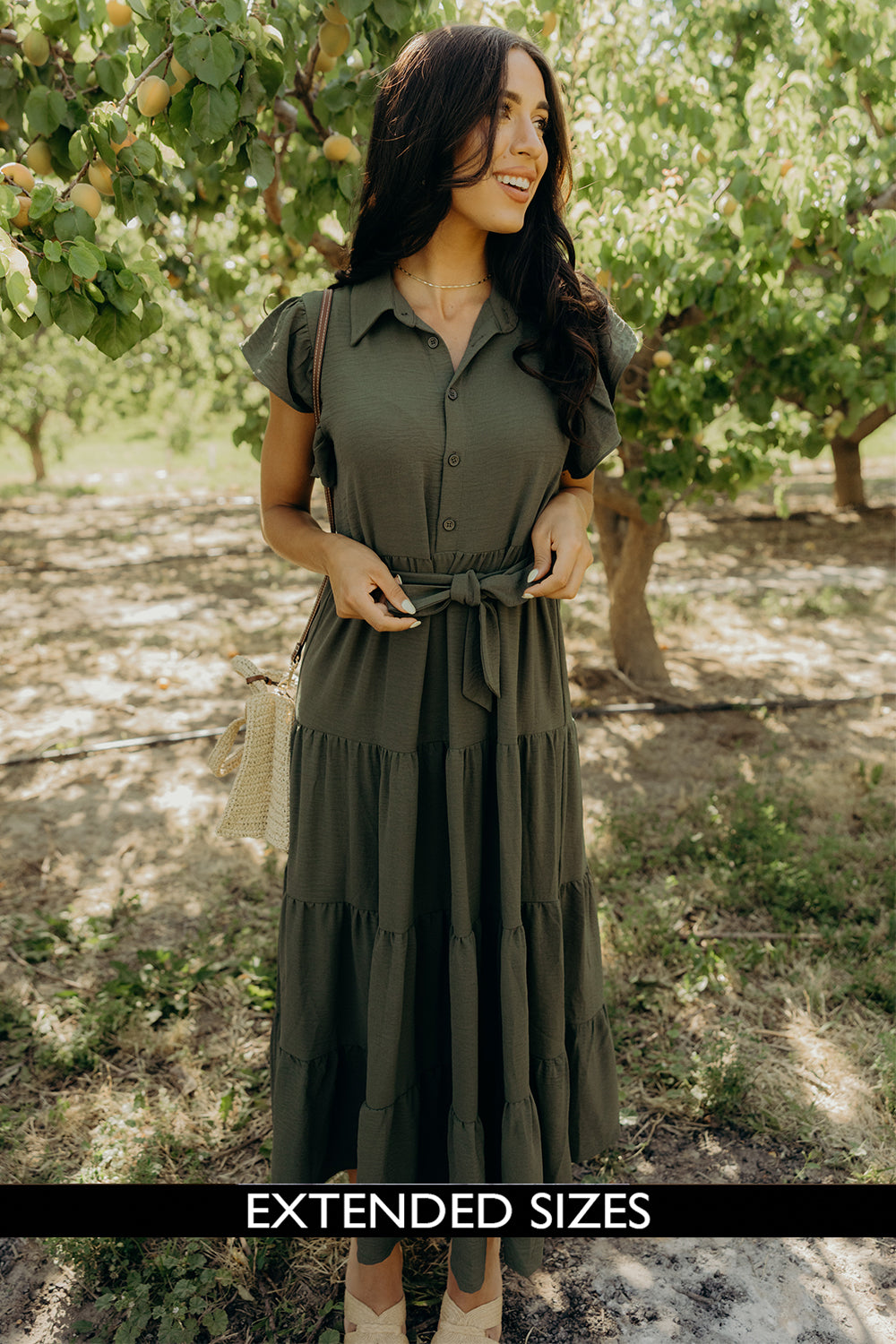 Slip into the enchanting Goldie Dress in Olive Green, a charming dress featuring flirty ruffle sleeves and a classic collar. With its playful button-down front, flattering waist tie, and bouncy tiered design, this beauty is ready for whatever adventures your day holds!