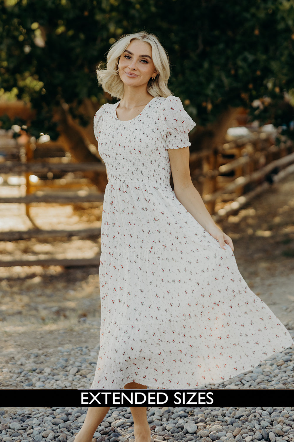 This cottage core dress is made with a lightweight woven fabric in white and features a natural pattern of red and green floral. It is fully lined and also has a smocked bodice with a round neckline, short puffed sleeves with smocked and ruffled ends, and a long, lined, tiered skirt with small ruffles along the skirt tiers.