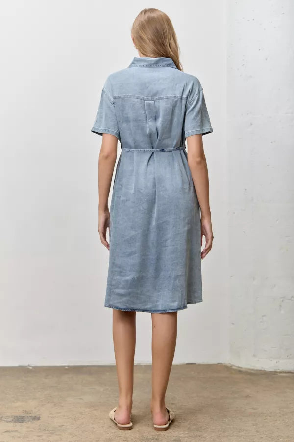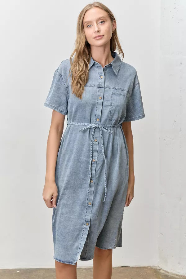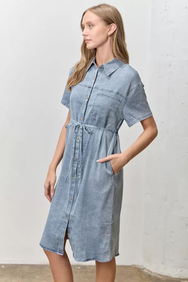 Dress up your denim game with this versatile shirt dress! The classic button-up front and crisp collar give it timeless appeal, while short sleeves keep things breezy and comfortable. Cinch the waist tie to show off your shape, or leave it loose for an easy, relaxed look. Functional pockets are the cherry on top—because who doesn't love a dress that actually holds your stuff?