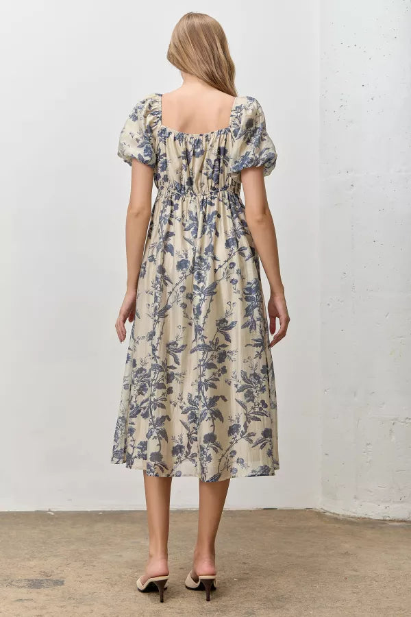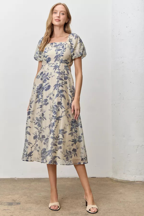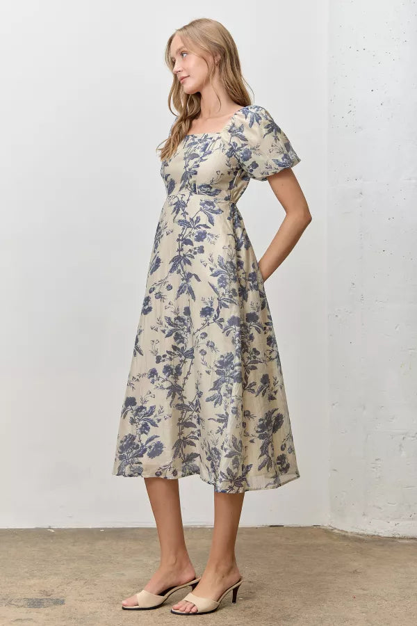 Meet your new go-to dress! This midi beauty features a charming navy floral print on a natural background that works with everything in your closet. The square neckline and adorable bubble sleeves give it a fun, feminine vibe, while the midi length keeps things polished and put-together. Hidden pockets mean you can actually carry your stuff, and the full lining provides all-day comfort and confidence.