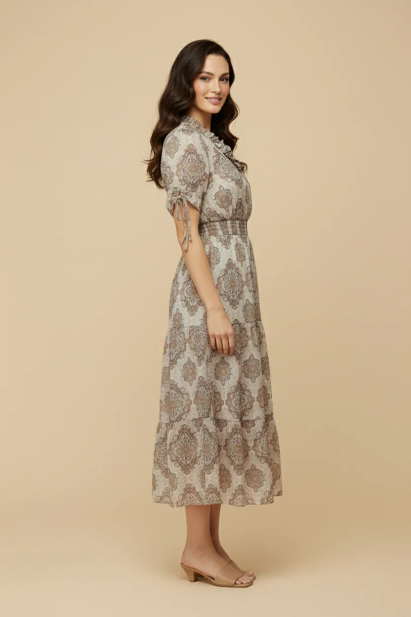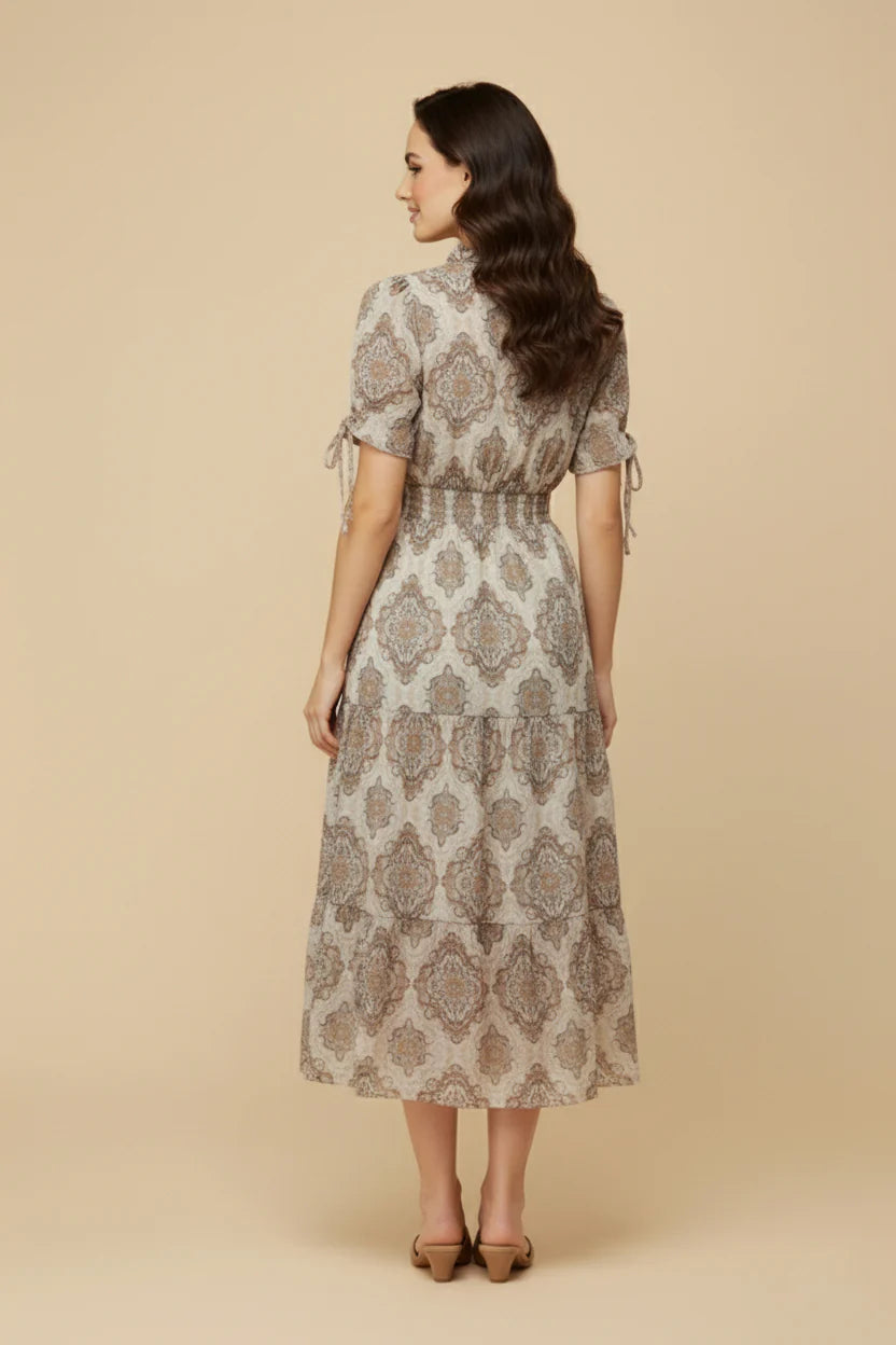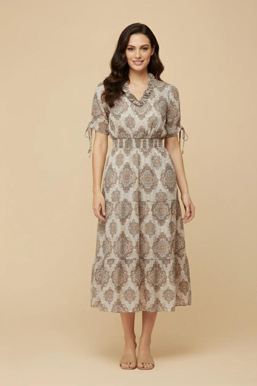 This charming taupe dress features a delightful floral print and flattering V-neckline that's perfect for any occasion. The smocked waist creates a playful silhouette while the short sleeves tie at the ends for an adorable touch. A tiered skirt adds movement and fun, and practical pockets keep you prepared. Finished with a hidden button closure in back and fully lined for comfort, this dress is as functional as it is fabulous.