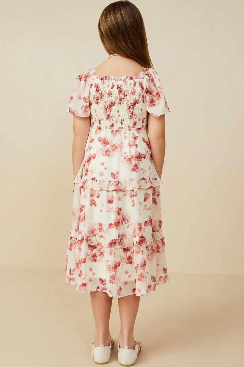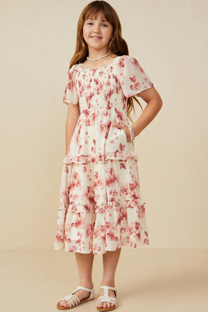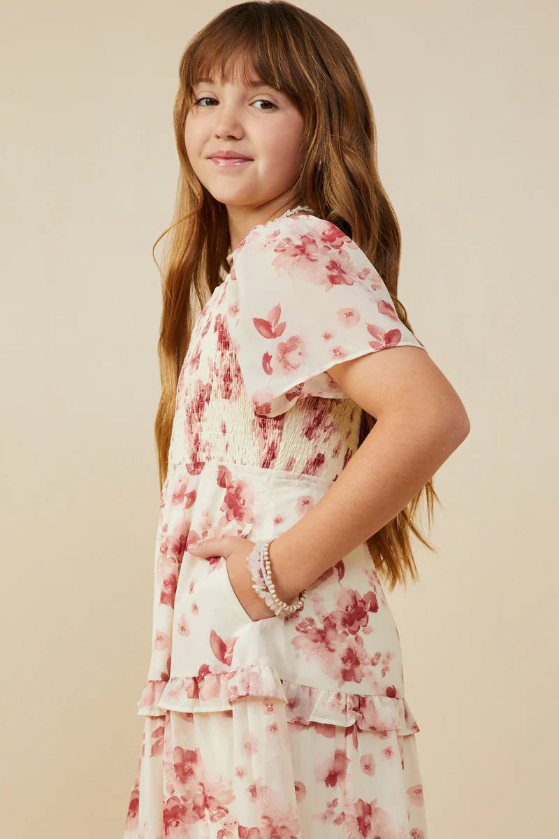 This charming dress brings effortless style to any occasion with its delicate pink and mauve florals dancing across a cream background. The smocked bodice offers a flattering fit while the square neckline and short sleeves keep things breezy and fun. A tiered, ruffled skirt adds twirl-worthy movement, and practical pockets make it perfect for little adventurers. Fully lined for comfort and durability, this dress is ready for playdates, parties, or everyday magic.