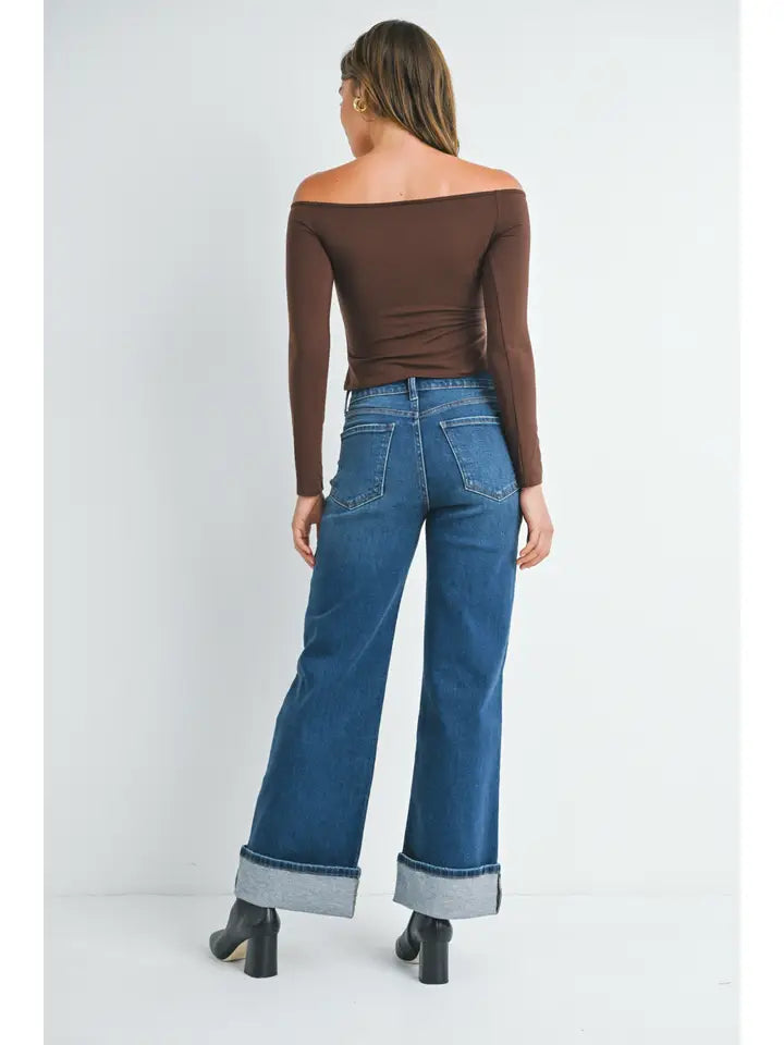 Dark blue denim jeans featuring wide legs, a little stretch, playful cuffs, and handy pockets for all your essentials.