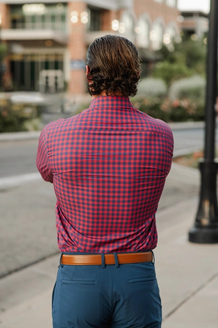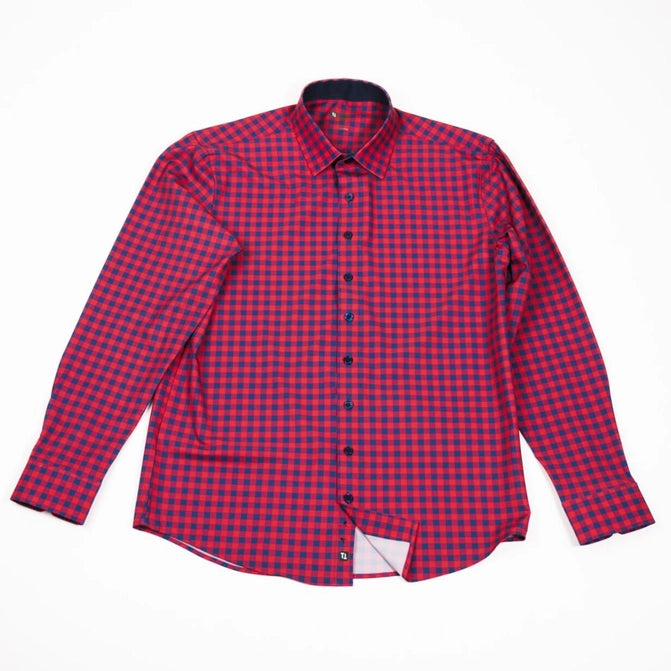 Hustle Men's Sport Shirt - Long Sleeve Slim in Red Navy Gingham
