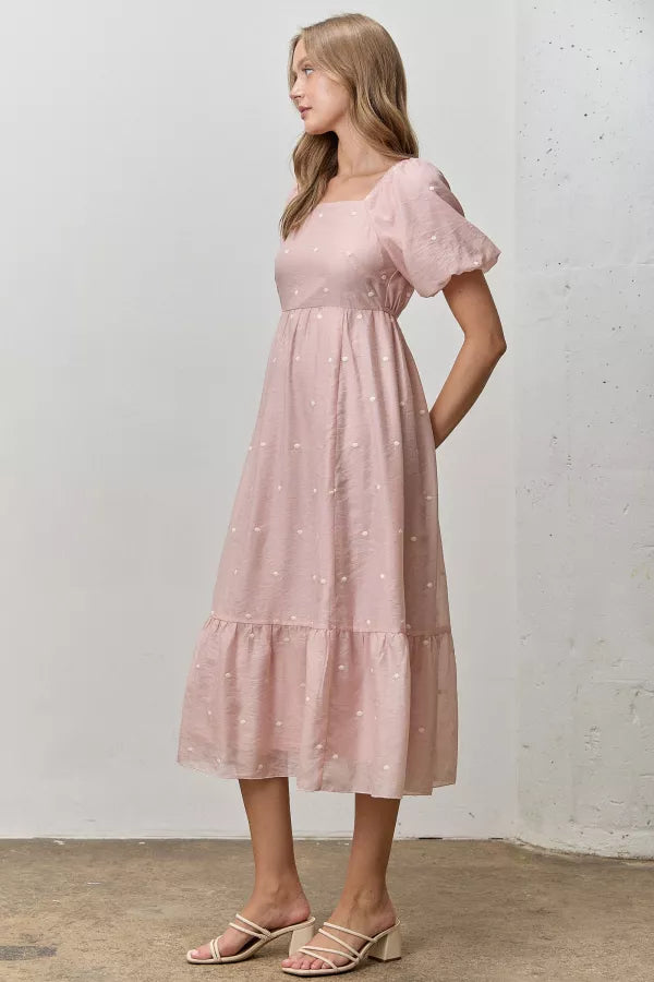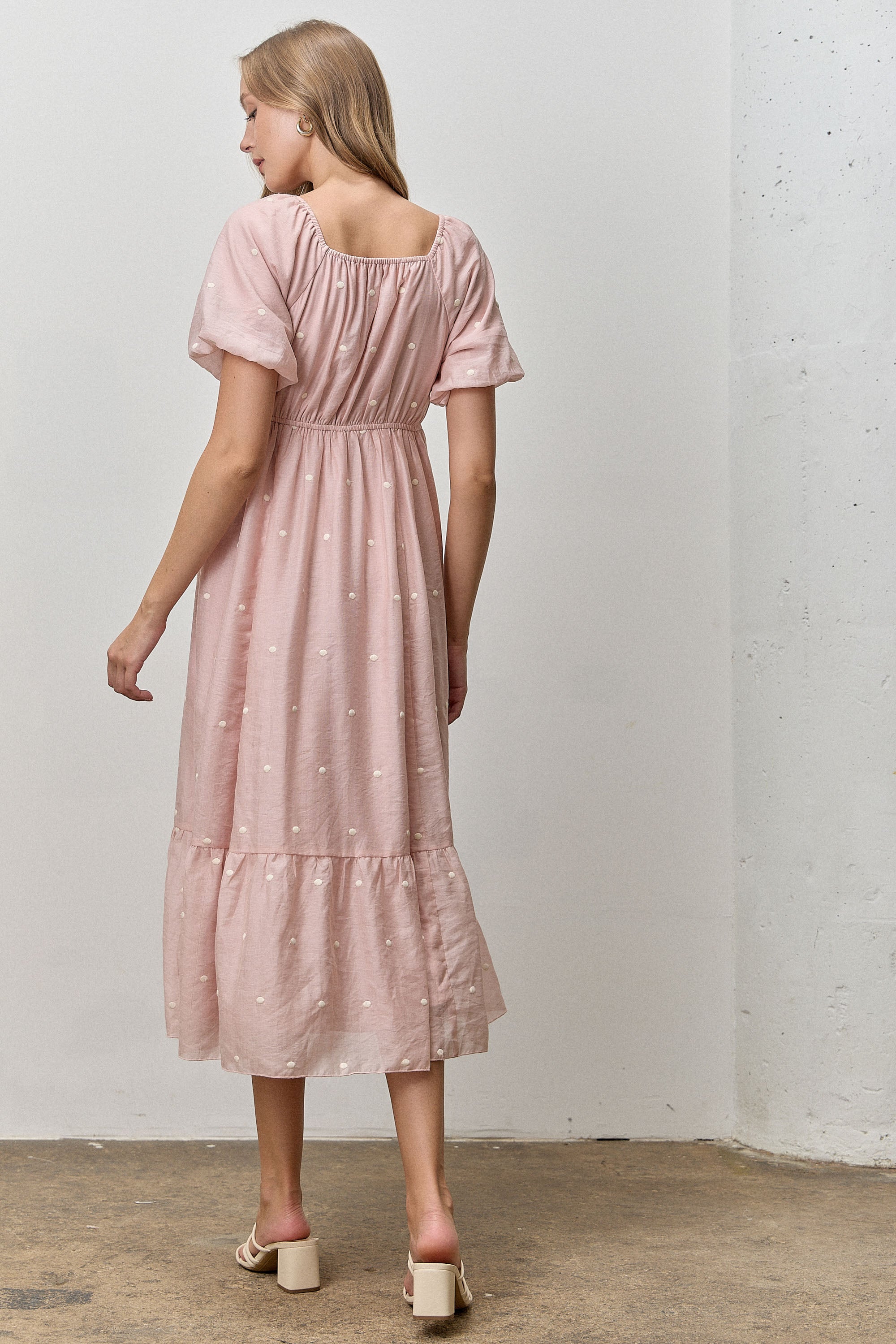 Brighten your wardrobe with this delightful blush dress featuring sweet cream embroidered polka dots that dance across the fabric. The charming square neckline and short sleeves offer a classic silhouette, while the tiered skirt adds movement and dimension with every step. Fully lined for comfort and confidence, this dress is perfect for everything from weekend adventures to special occasions. It's the kind of piece that makes you smile every time you put it on.