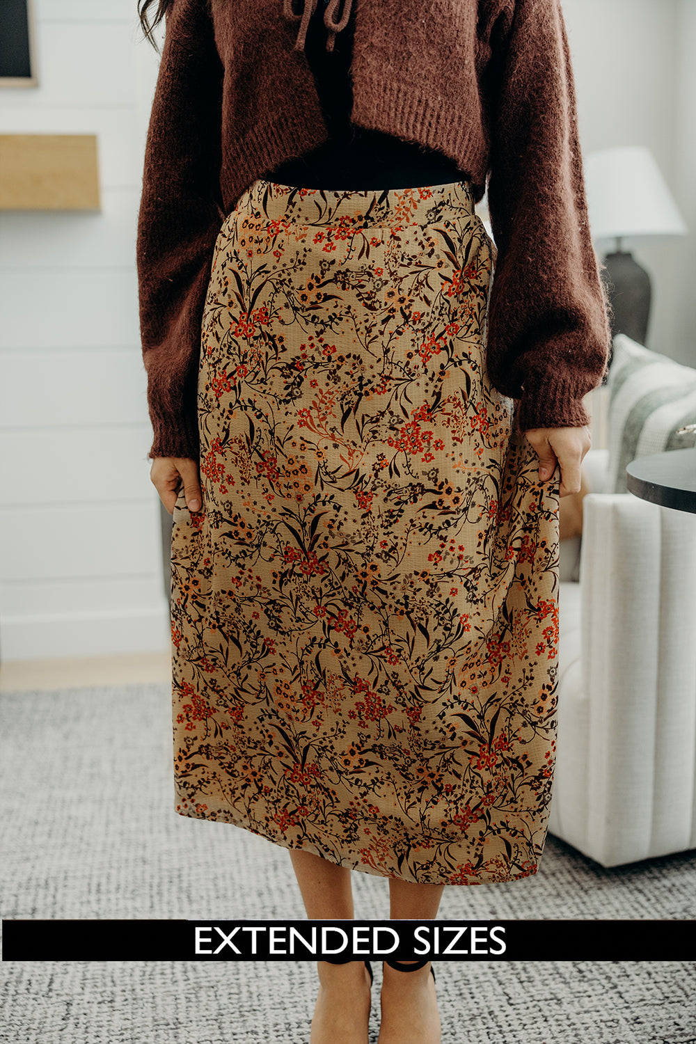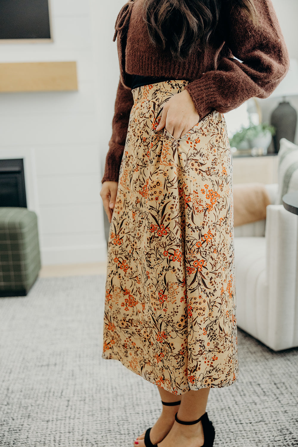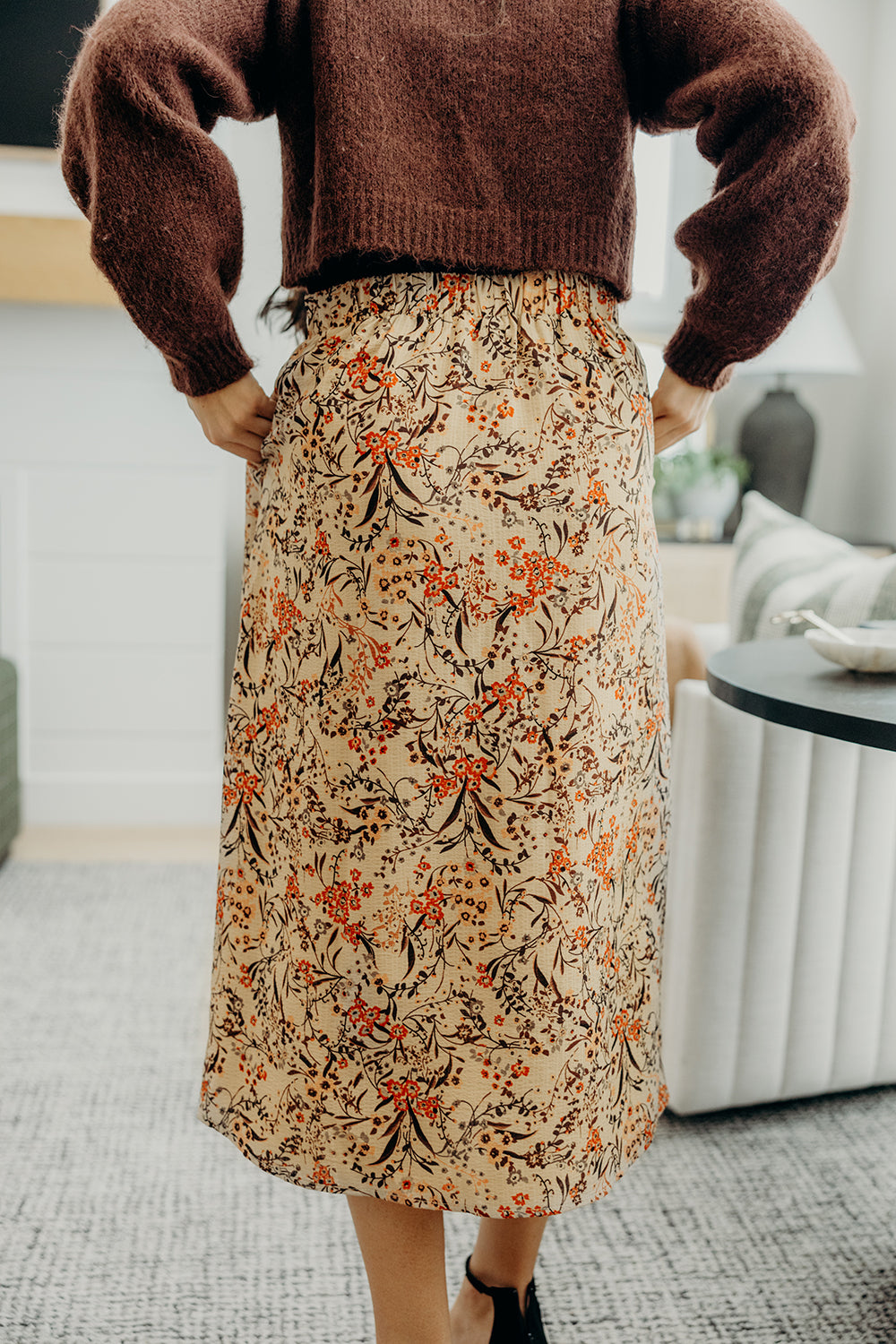 This brown midi skirt features a charming floral print, a comfy elastic waistband, handy pockets, and a smooth fully lined interior. Perfect for adding a fun, flirty touch to your wardrobe!