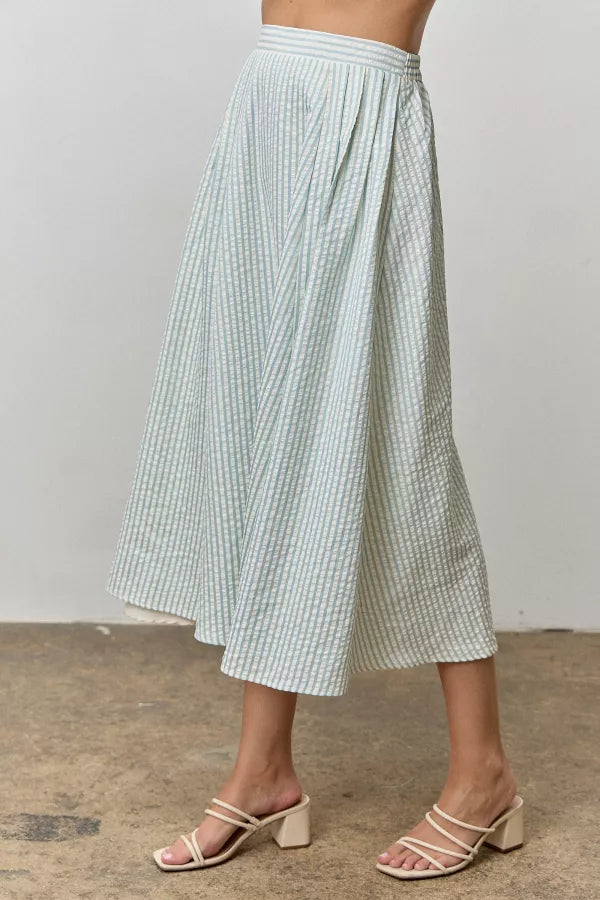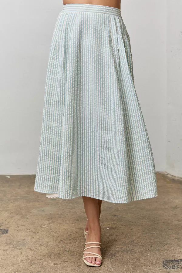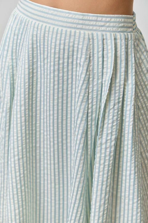 Stripes that pop in cream and blue make this skirt a wardrobe essential. The elastic back waist keeps you comfy all day long, while the full lining ensures a smooth, polished look from every angle. Perfect for mixing and matching with your favorite tops.