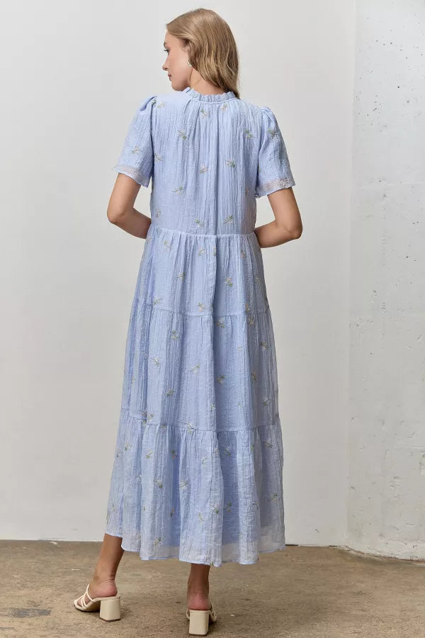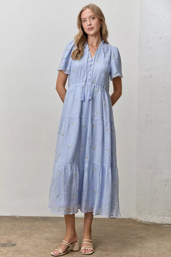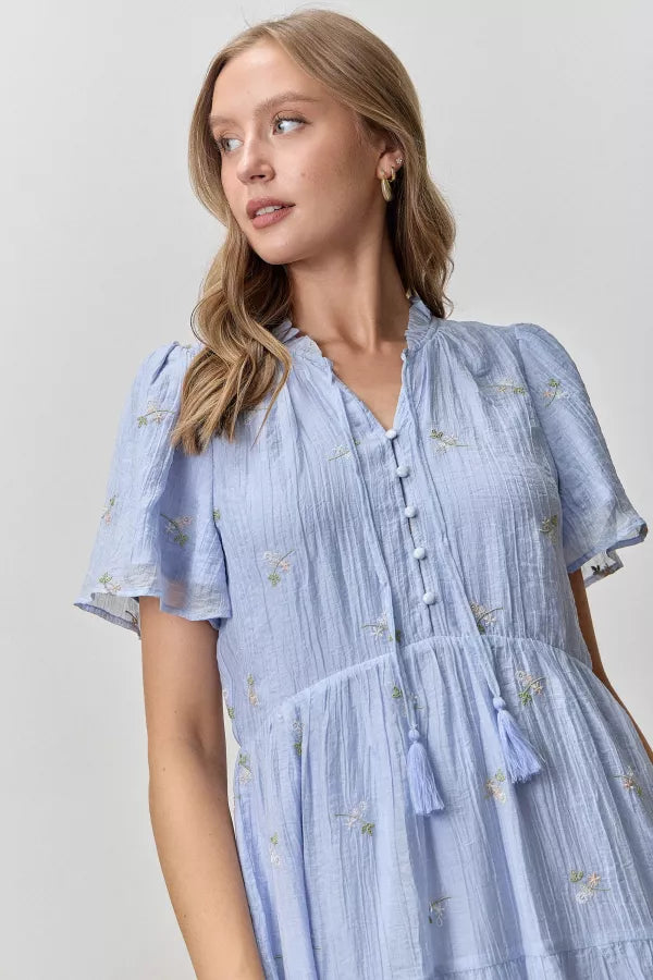 Slip into effortless charm with this blue dress featuring delicate floral embroidery in soft greens, creams, and peachy tones. A playful ruffle neckline with tie detail and button-down front make getting dressed fun, while flowy short sleeves and a tiered skirt create a breezy, twirling silhouette. Fully lined for comfort and confidence all day long.