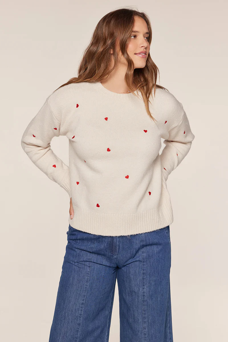Cozy up in this charming ivory sweater featuring delightful red embroidered hearts scattered across the front. The classic crew neckline and long sleeves make it perfect for layering or wearing solo when you want to add a touch of whimsy to your everyday look. A sweet wardrobe staple that celebrates love in the most adorable way.