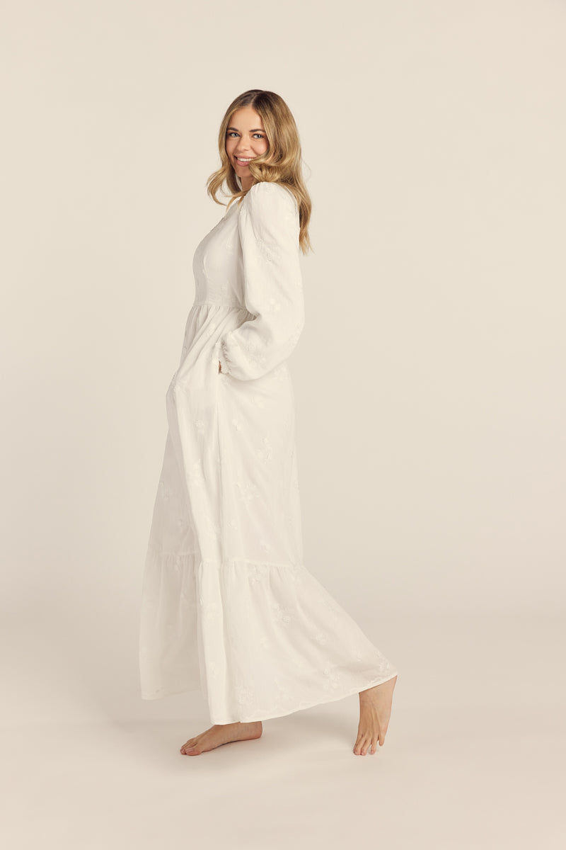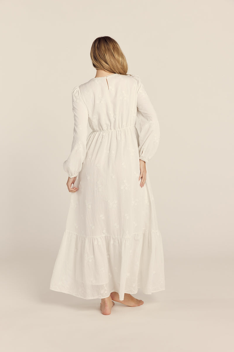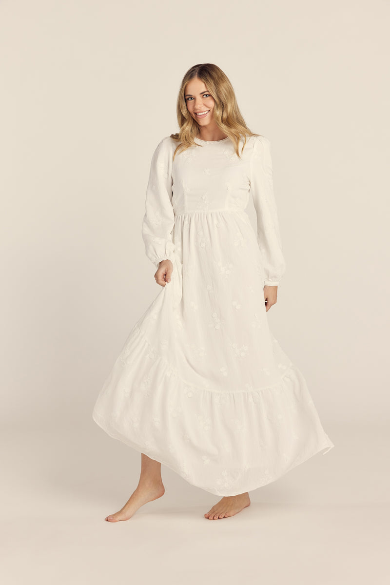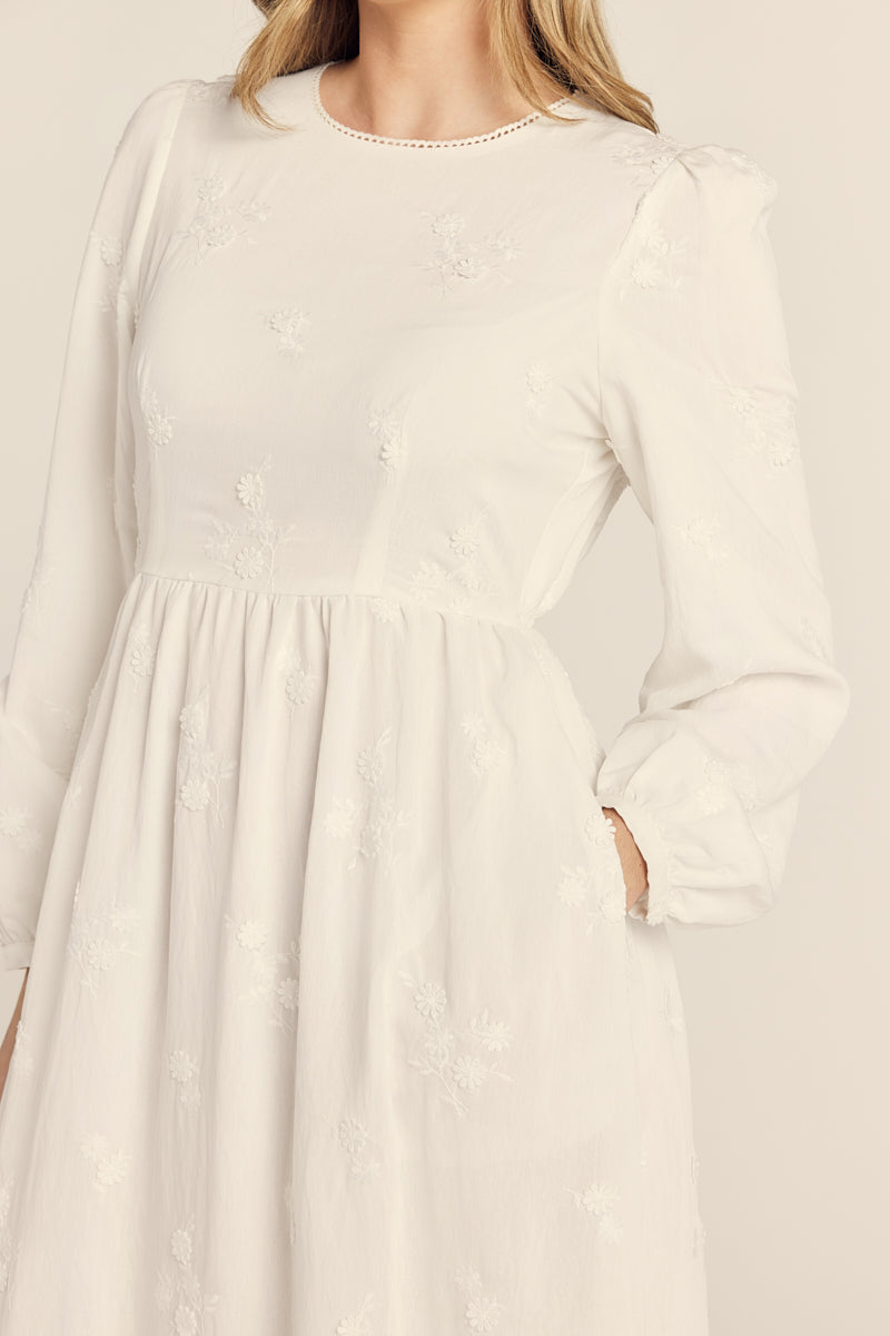 The Acacia Embroidery Floral Temple Dress in Creamy White
