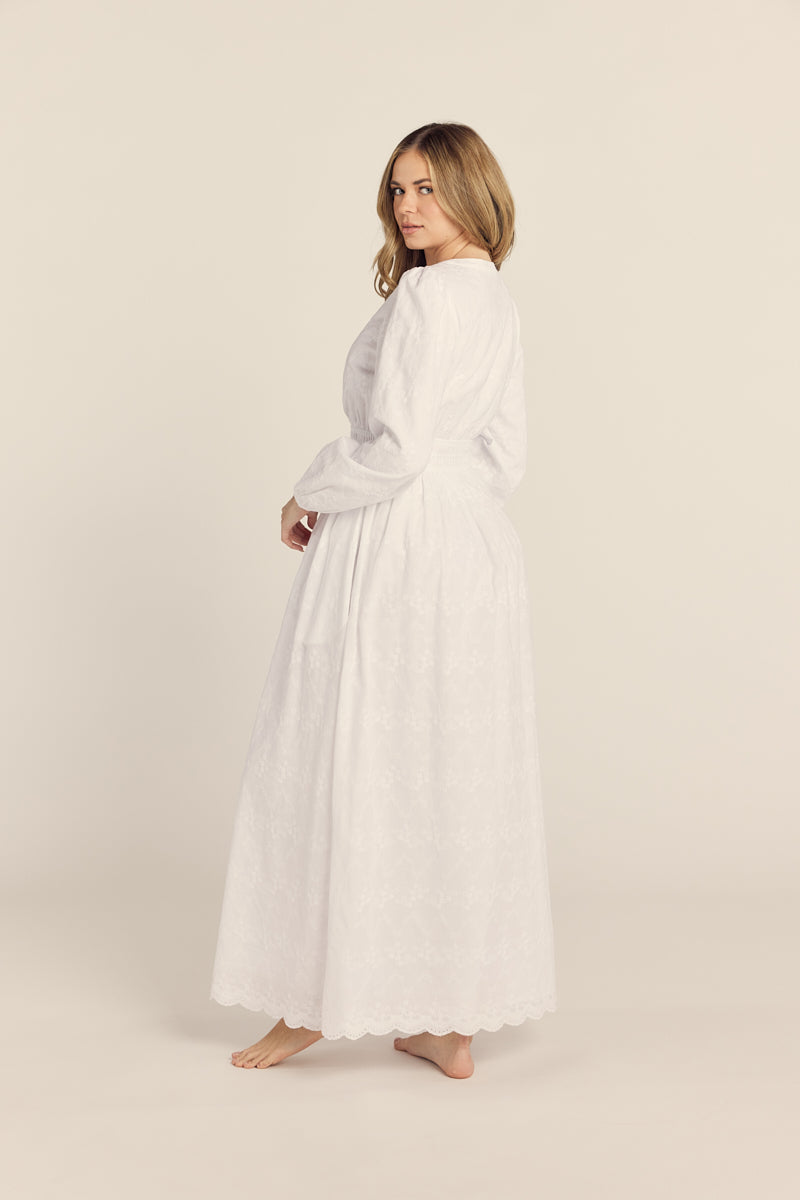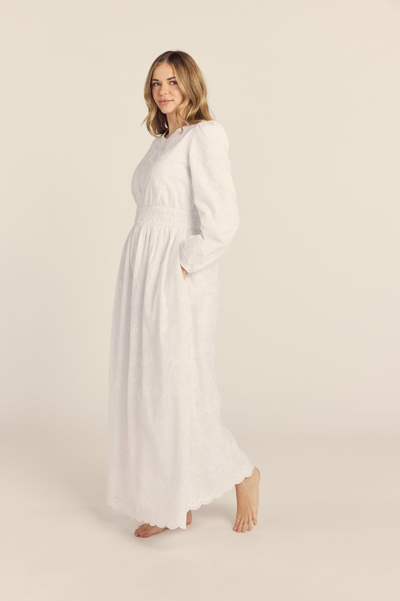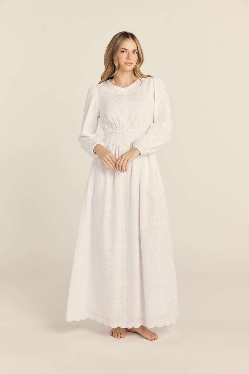 Introducing the Ellen—your new favorite temple dress that's as practical as it is pretty! This charming white dress features a convenient front zipper for easy on-and-off, paired with a comfy elastic waist that moves with you. The round neckline and long sleeves (complete with wrist elastic) keep things modest and put-together, while delicate lace trim at the hem adds a touch of elegance. Fully lined for comfort, plus functional pockets because who doesn't love a dress with storage? Crafted from 100% cotton, it's breathable and easy to care for.