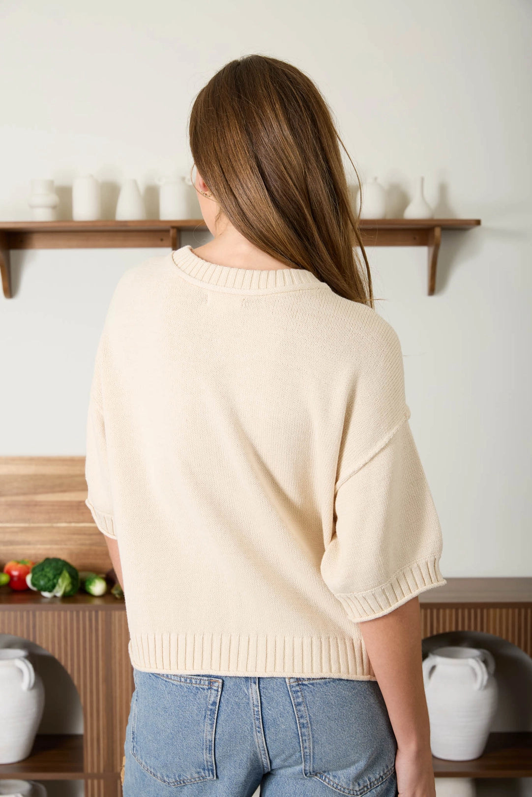 The Astra Short Sleeve Cardigan in cream is a versatile layering essential. Featuring a classic round neckline, button-down front, and short sleeves, it pairs effortlessly with any outfit. Distinctive exposed seams and raw edge trim add modern texture and visual interest. The soft cotton-acrylic blend offers comfort and durability for everyday wear.