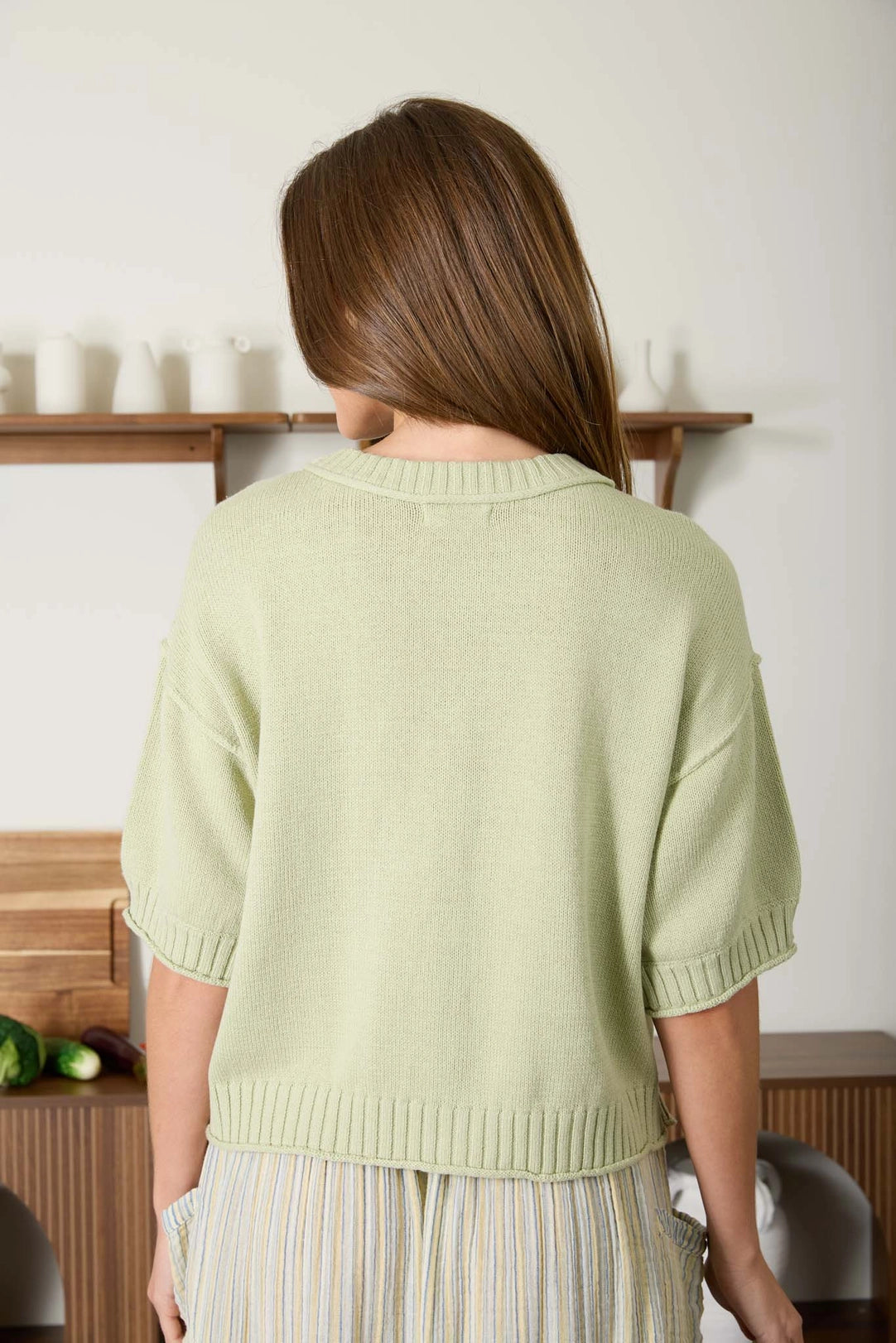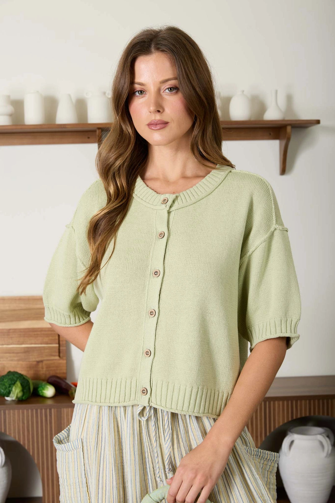 The Astra Short Sleeve Cardigan in light olive is a versatile layering essential. Featuring a classic round neckline, button-down front, and short sleeves, it pairs effortlessly with any outfit. Distinctive exposed seams and raw edge trim add modern texture and visual interest. The soft cotton-acrylic blend offers comfort and durability for everyday wear.