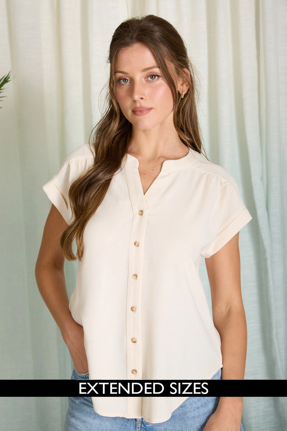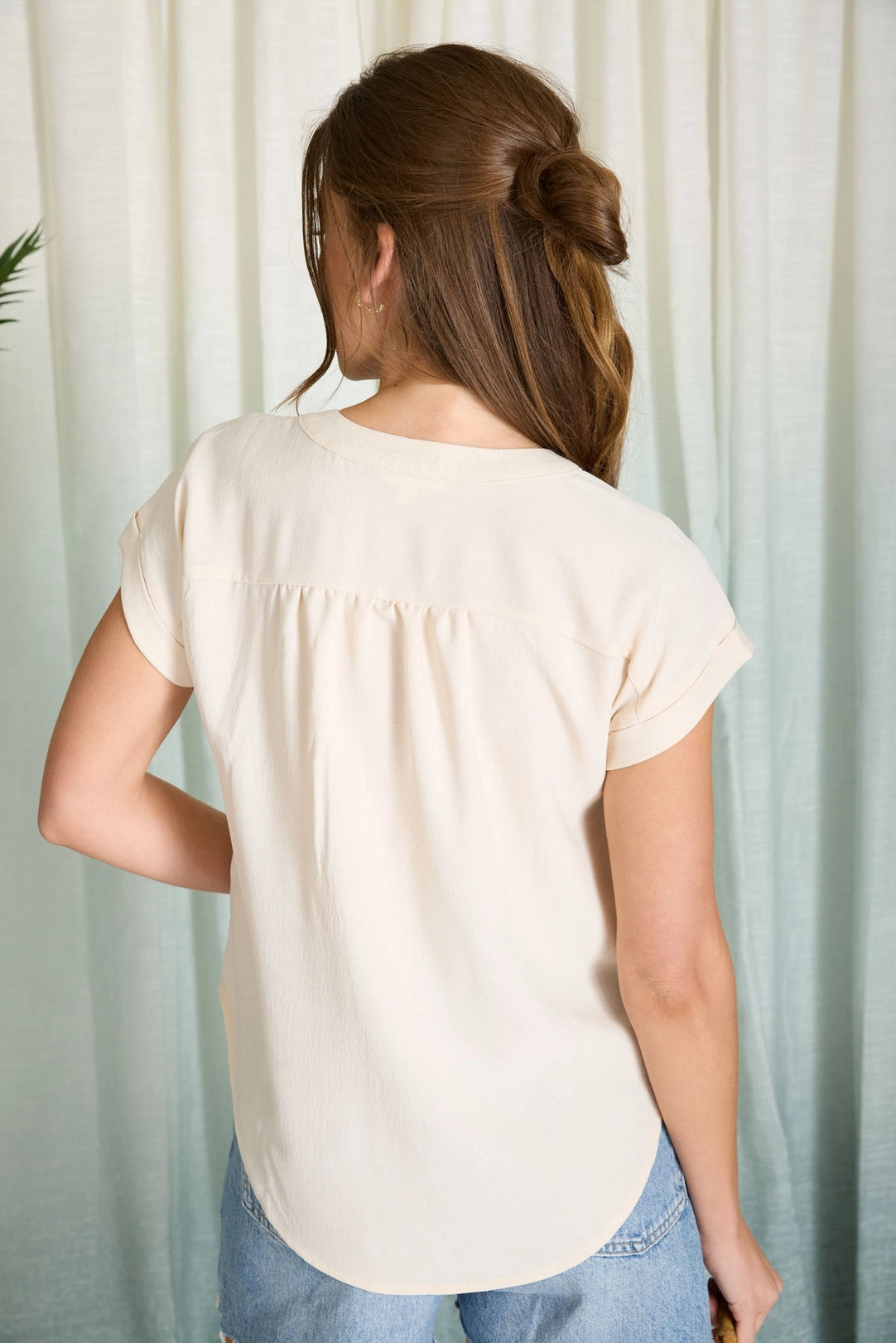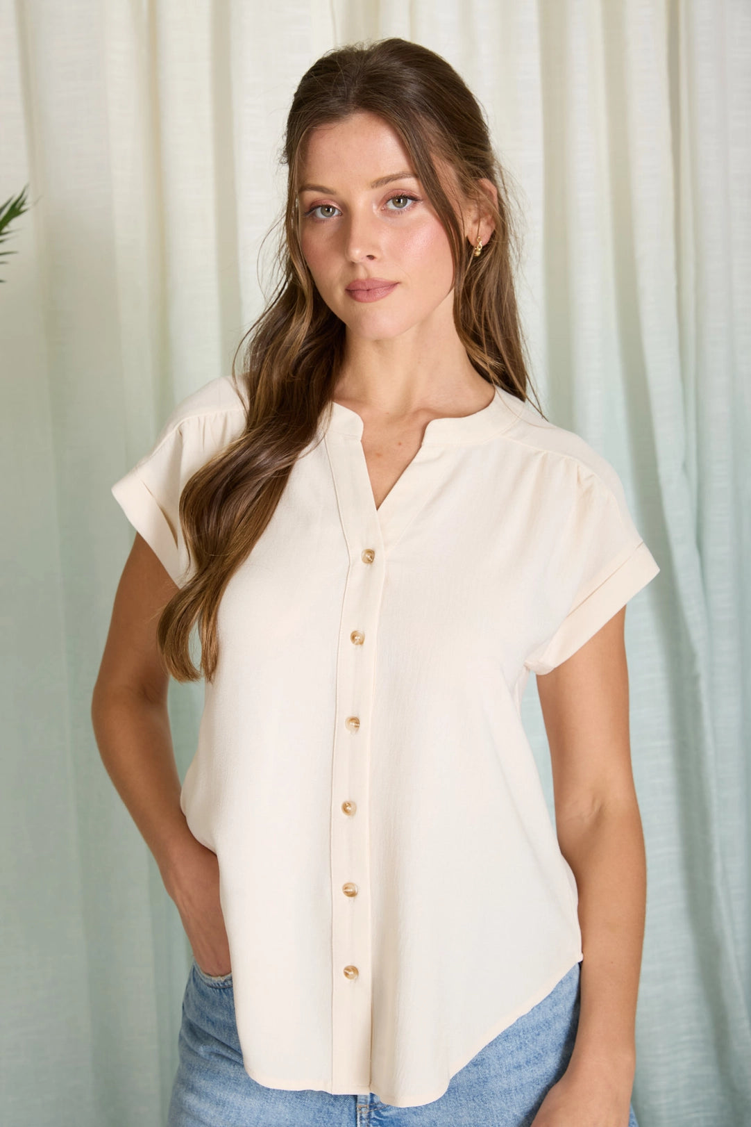 The Isadora Short Sleeve Top in Light Khaki is a versatile wardrobe essential featuring a flattering split neckline and functional button-down front. Designed with thoughtful details including shoulder gathering and a structured back yoke, this lightweight woven top offers both style and comfort. Short cuffed sleeves make it perfect for layering or wearing solo during warmer months.