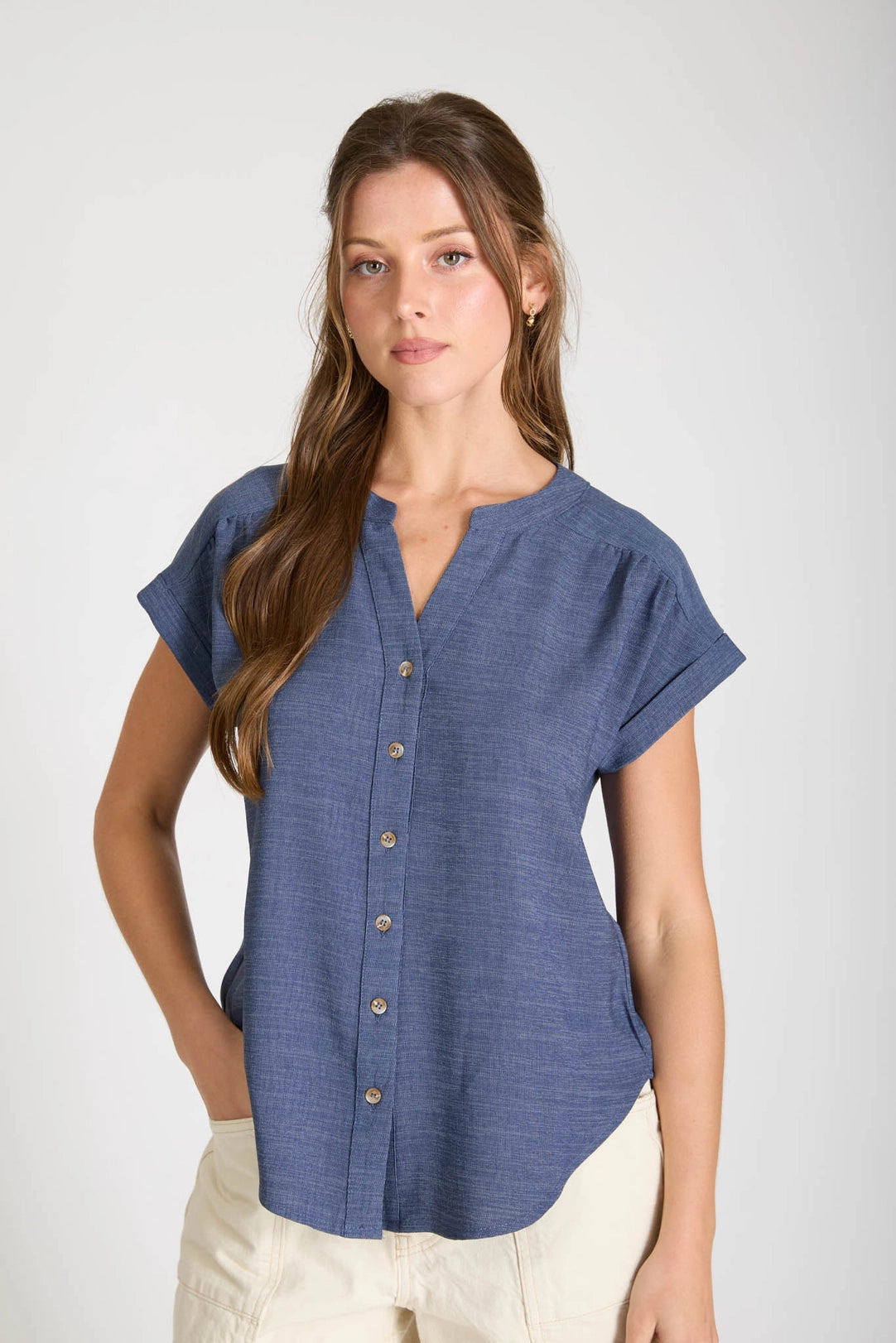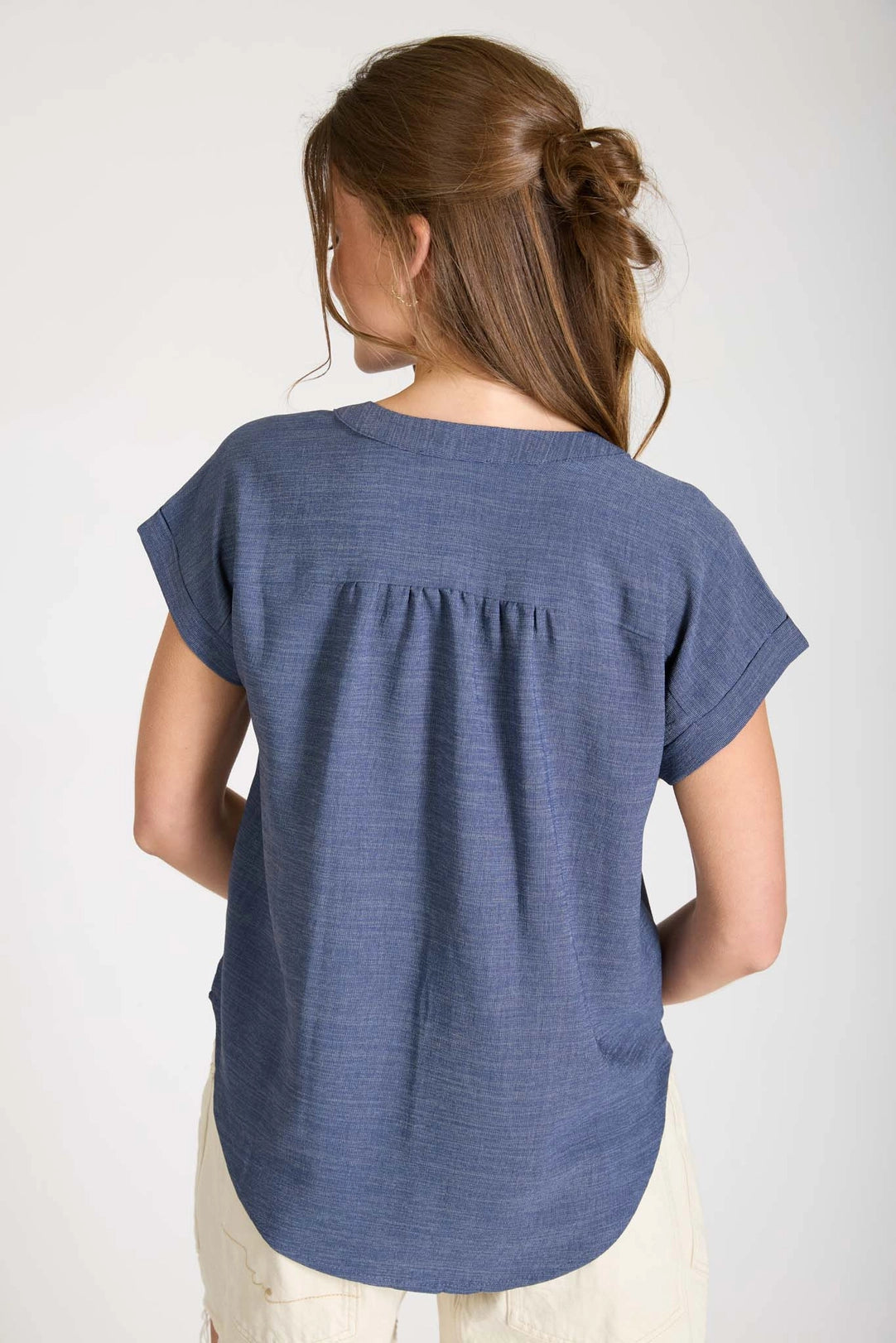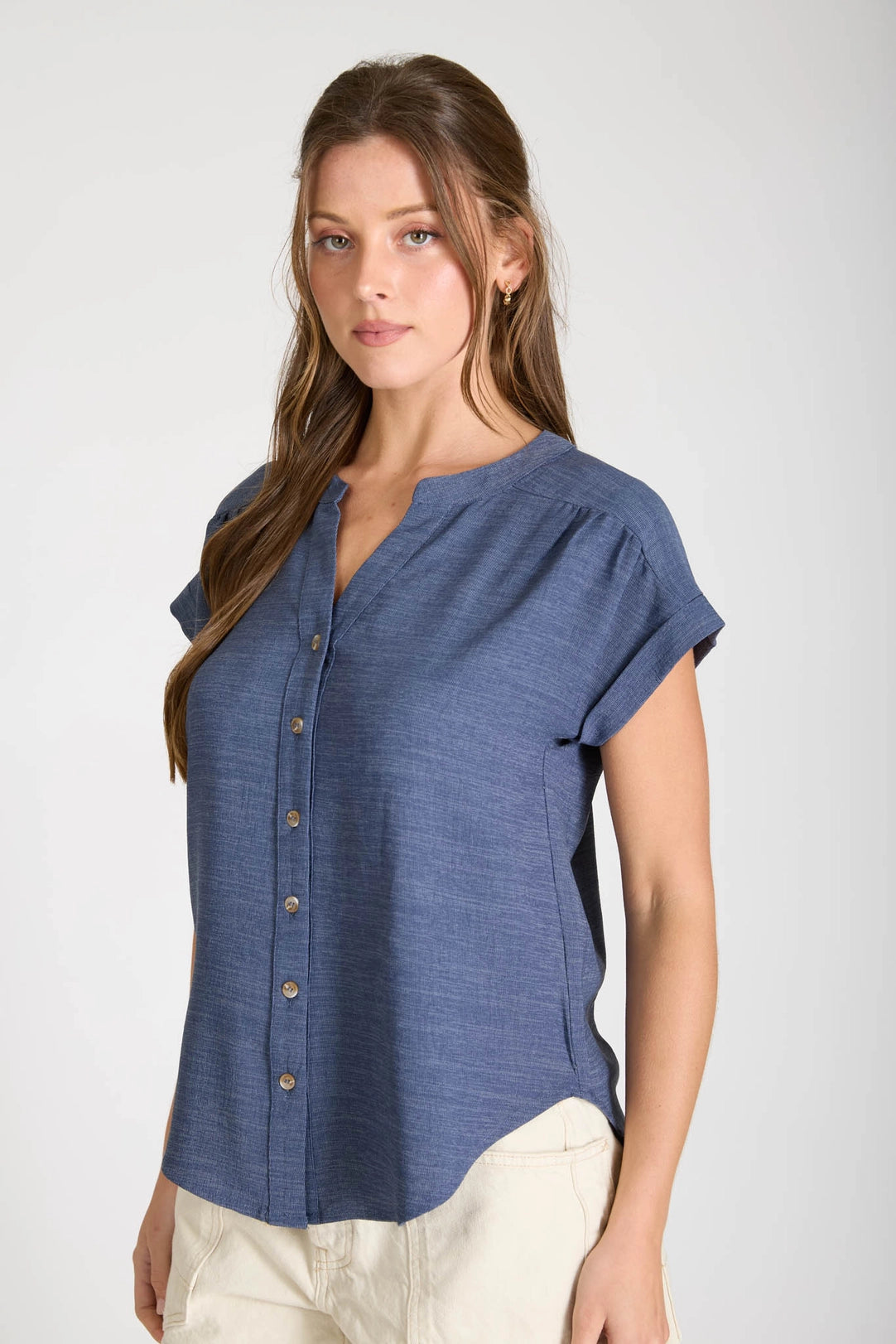 The Isadora Short Sleeve Top in Navy is a versatile wardrobe essential featuring a flattering split neckline and functional button-down front. Designed with thoughtful details including shoulder gathering and a structured back yoke, this lightweight woven top offers both style and comfort. Short cuffed sleeves make it perfect for layering or wearing solo during warmer months.