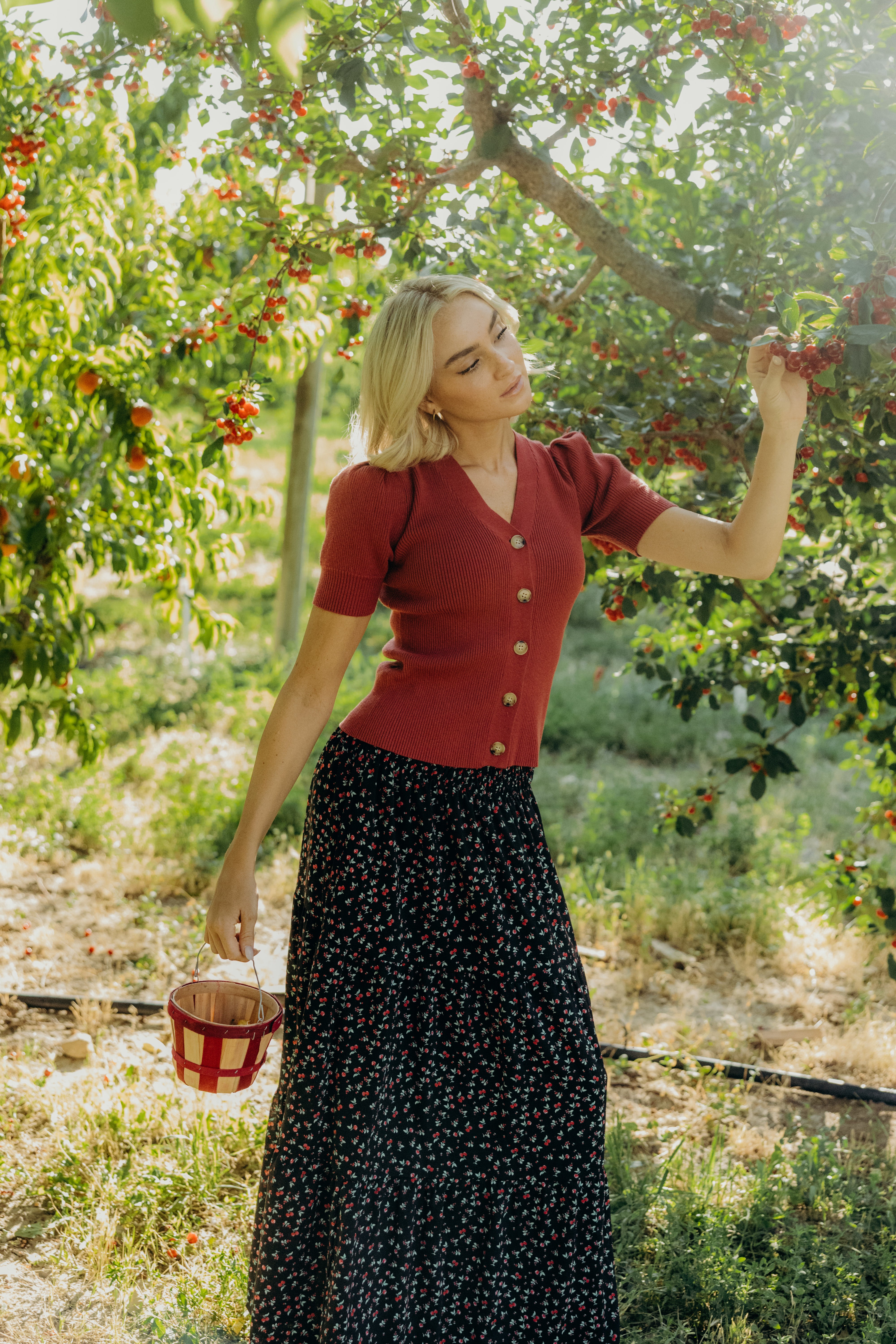 Get ready to twirl in this darling black Maxi Skirt with a whimsy cherry pattern– it features an elastic waist for ultimate comfort, this tiered skirt is fully lined and oh so stylish. Ready to make a statement? Look no further!