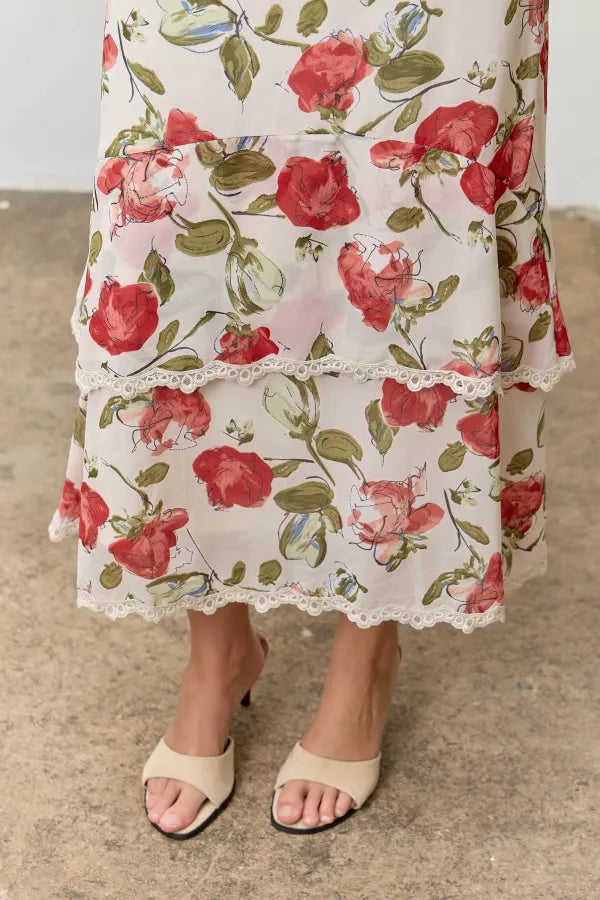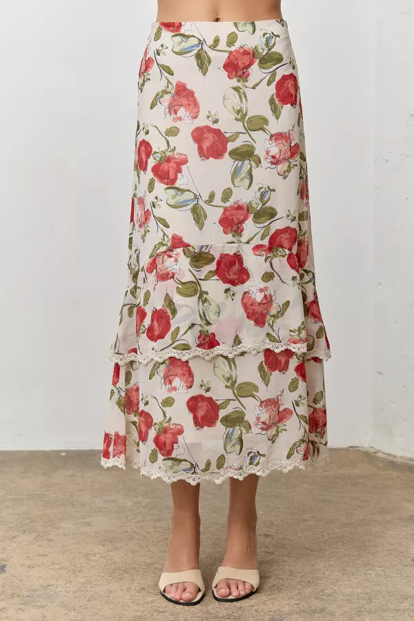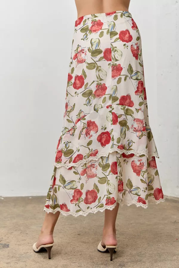 Make a statement with this enchanting floral midi skirt that's bursting with personality. The romantic red blooms on a cream background dance across tiered layers, each finished with delicate lace trim for that extra touch of whimsy. A sleek side zipper keeps things streamlined, while the soft lining ensures all-day comfort. It's the kind of skirt that turns heads and makes you feel fabulous.