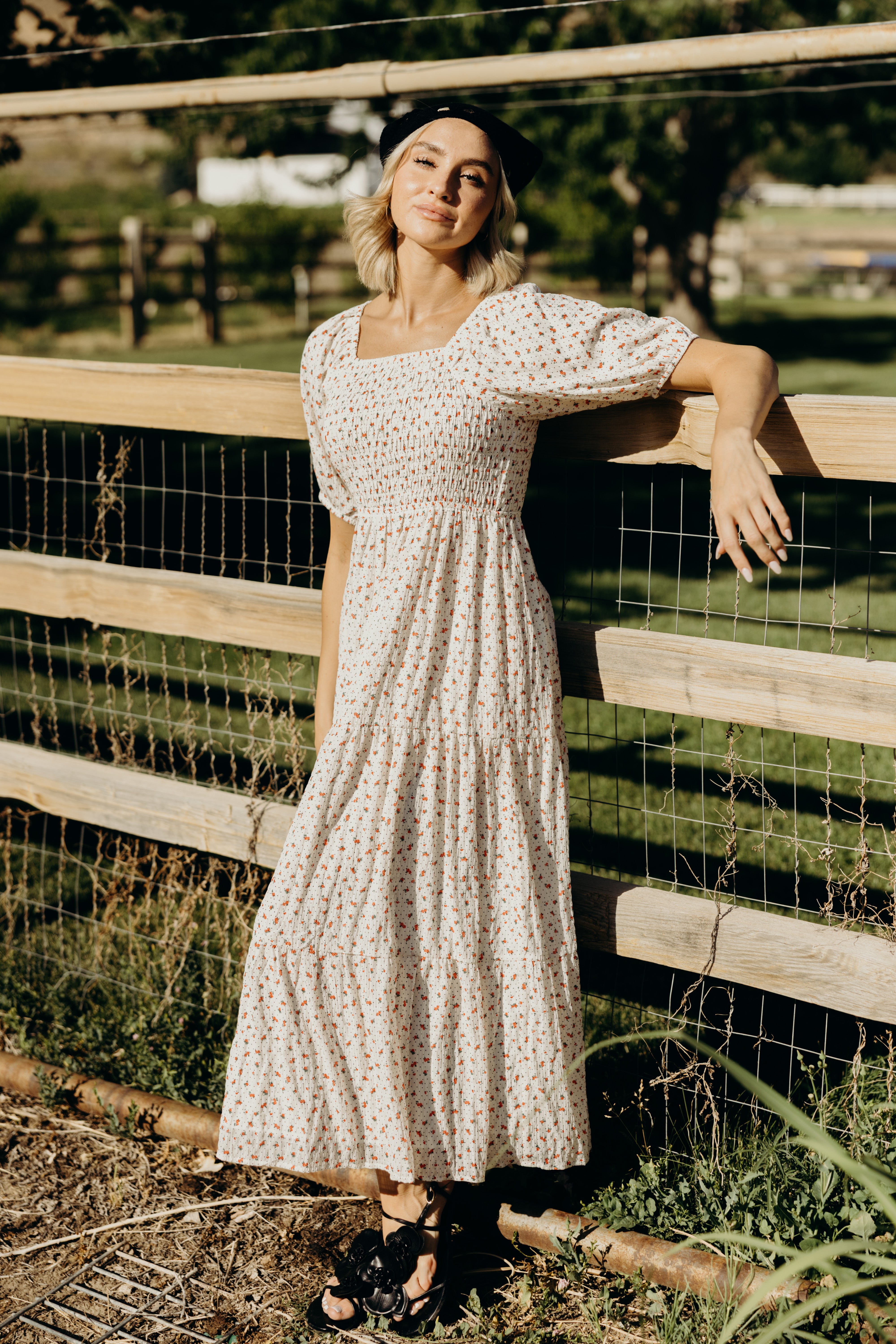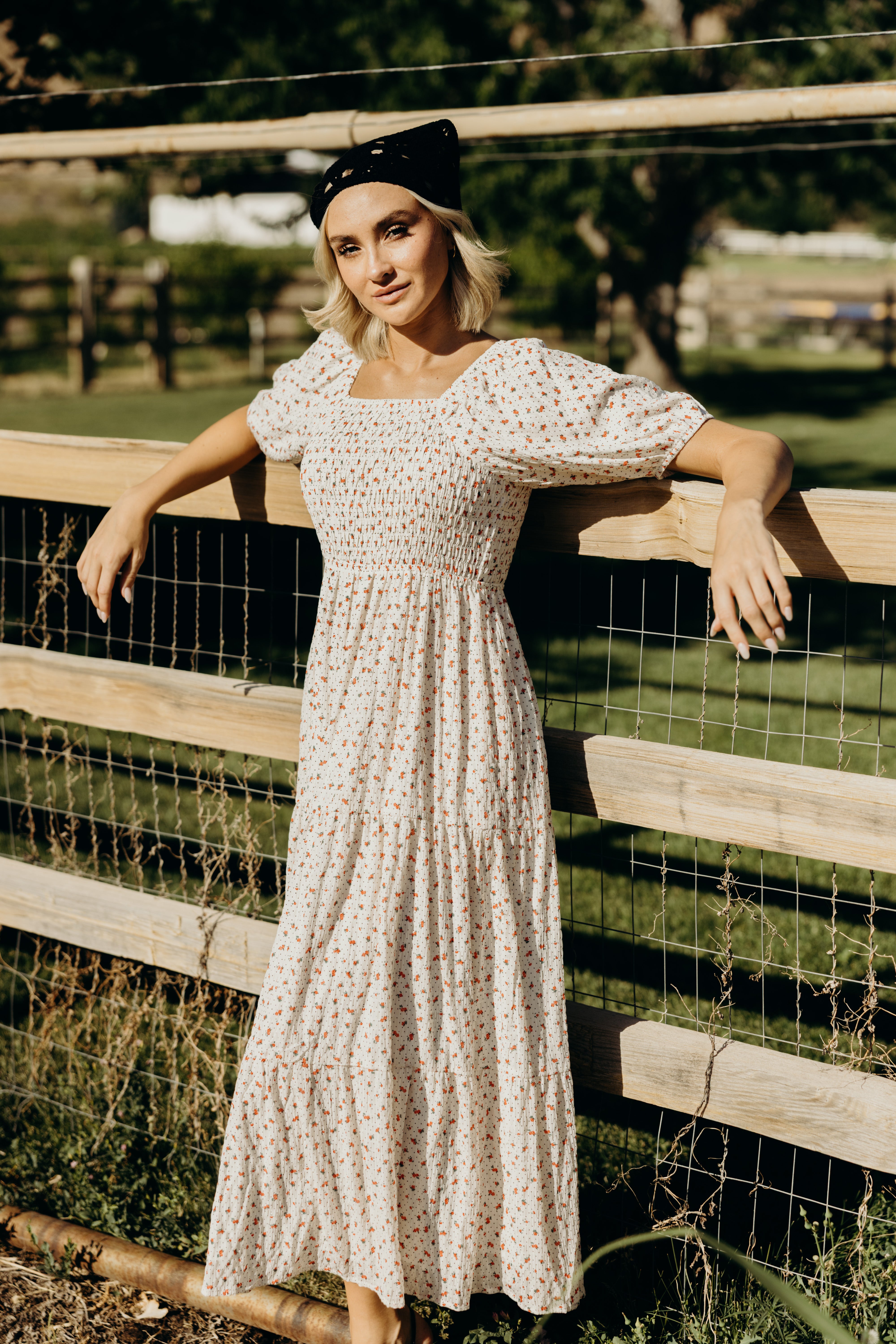 This darling dress is made with smooth woven cream fabric with a small floral pattern of red roses and black polka dots- fully lined. It has an elastic square neckline, a smocked bodice, short puffed sleeve gathered with elastic at the ends, and a full, tiered, midi-length skirt WITH inseam skirt pockets!
