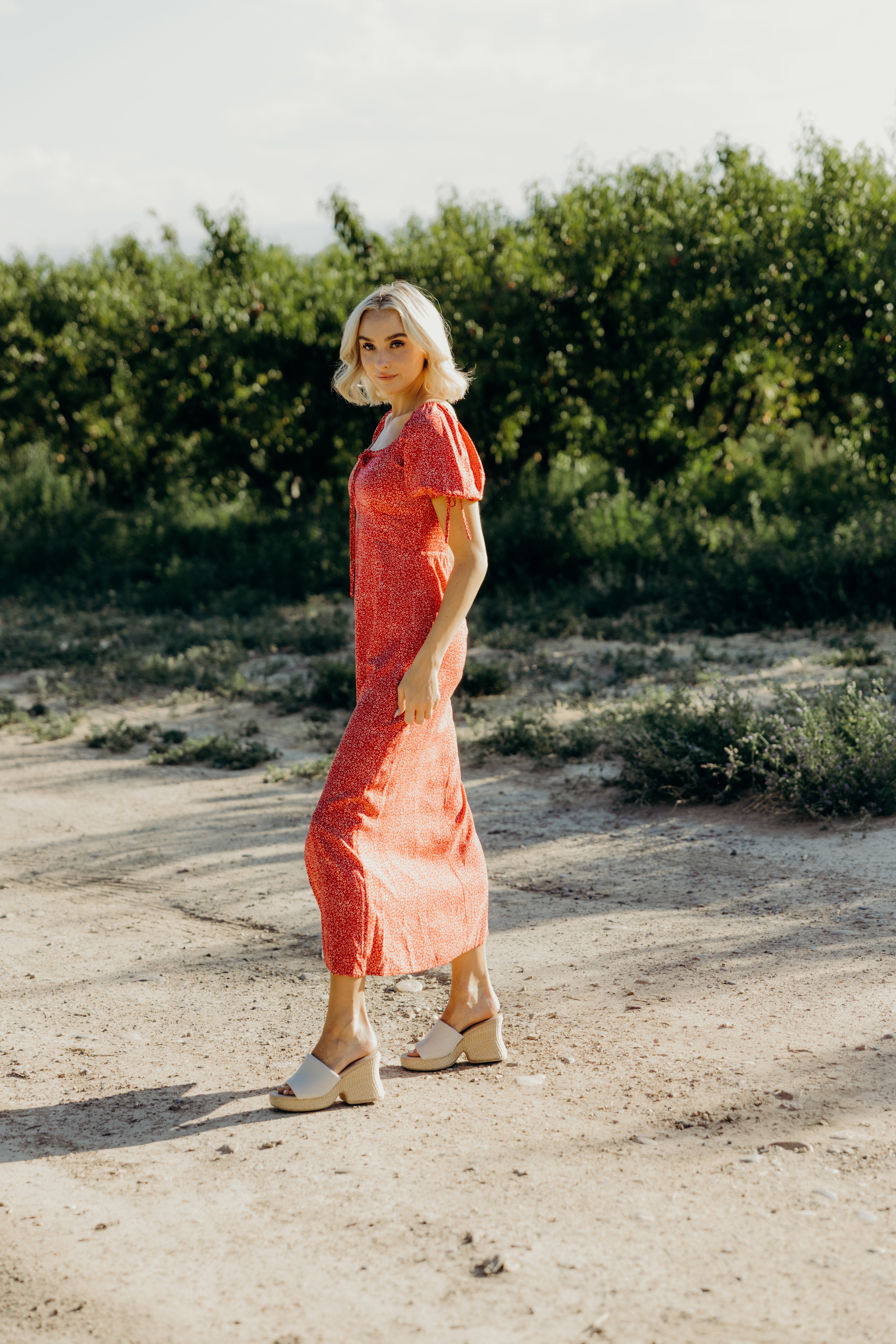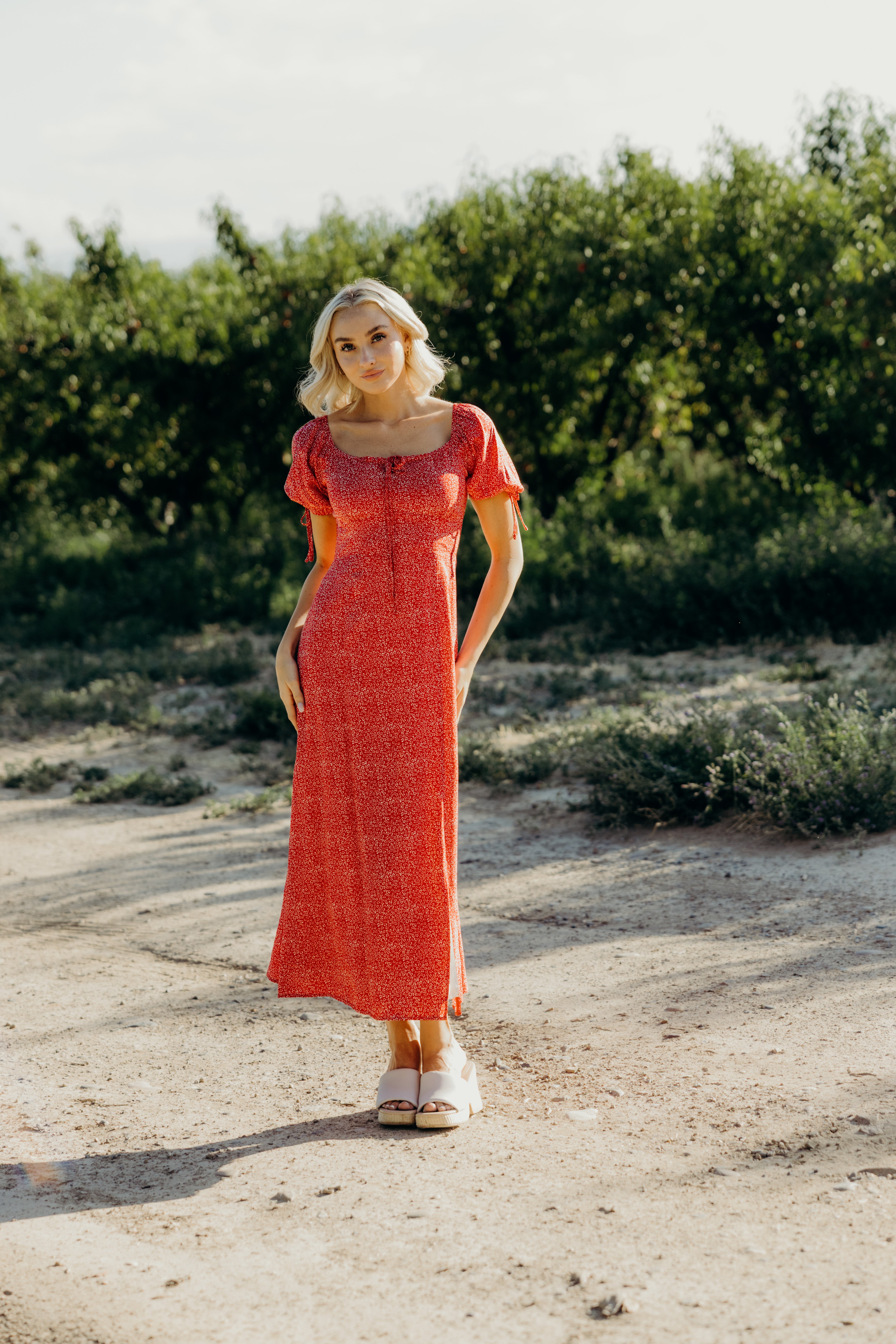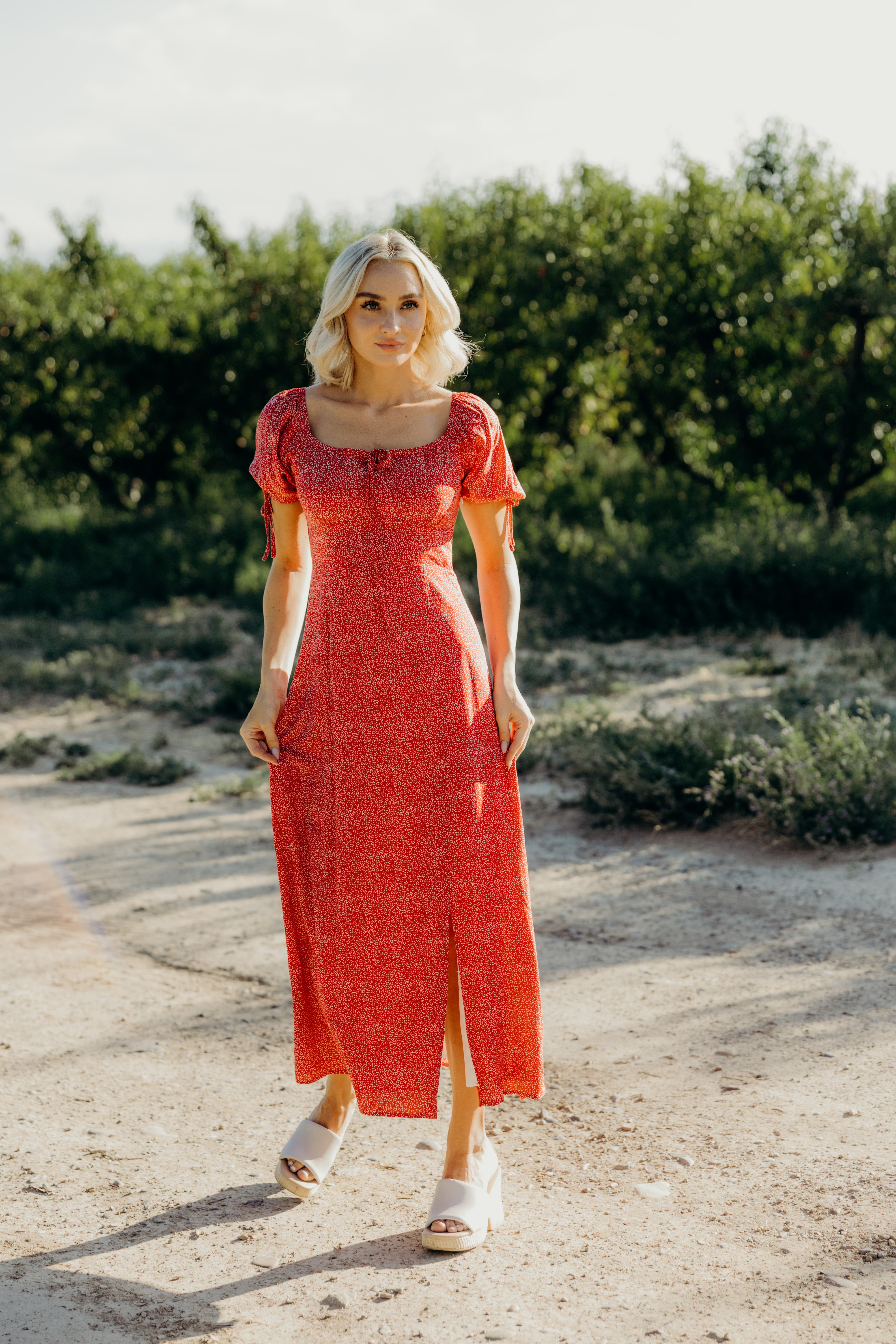 Slip into this charming berry-hued midi dress that's bursting with personality. Delicate white florals dance across the fabric, while a flattering square neckline frames your shoulders beautifully. The back features smocking for a touch of gathered elegance, and short sleeves tie at the cuffs for an adorable detail. Fully lined and a convenient side zipper makes getting dressed effortless, and a front slit adds just the right amount of flirty movement. Perfect for days when you want to look put-together without trying too hard.