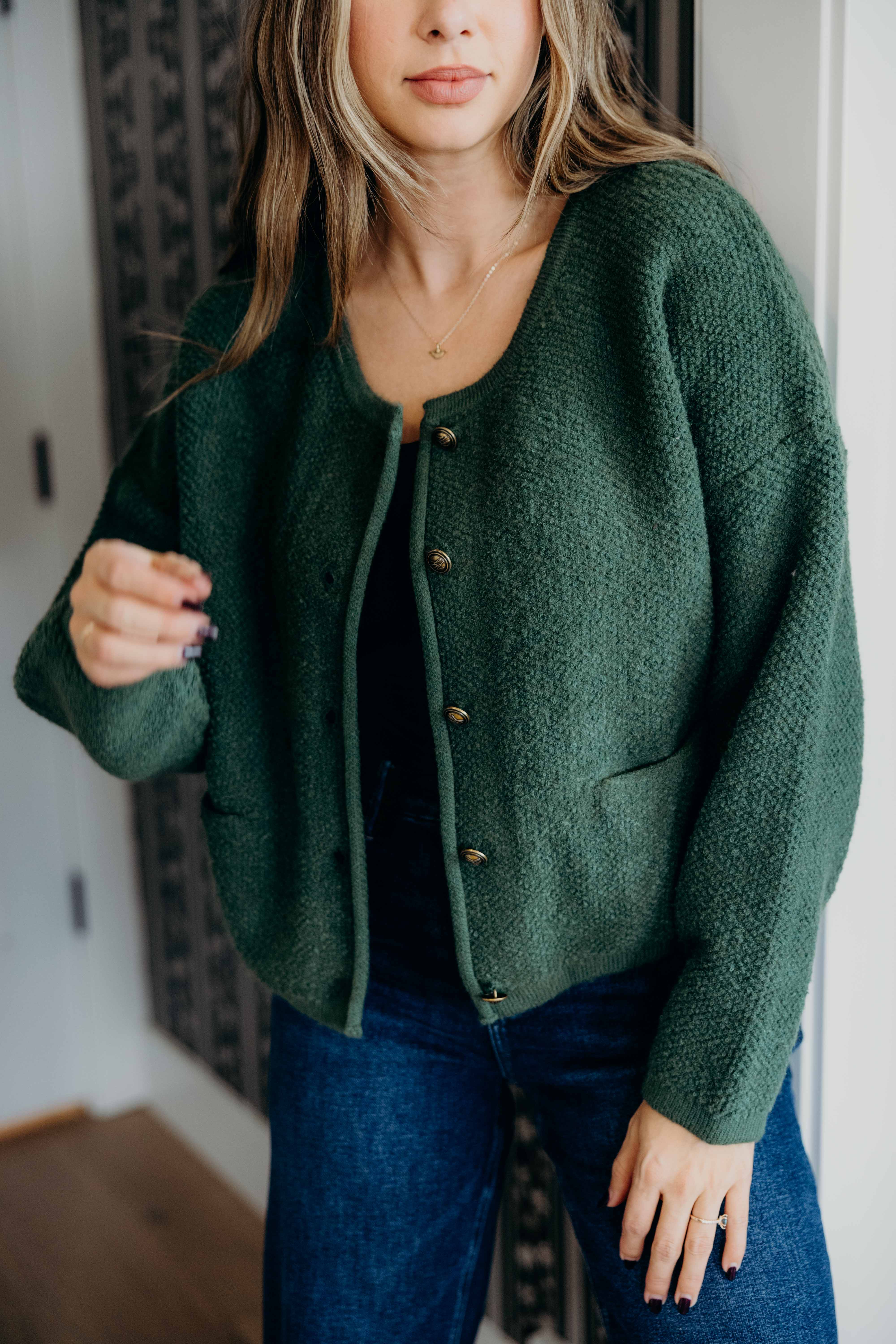 This fir green colored oversized cardigan features shiny gold buttons, a cute round neckline, and two handy front pockets. Perfectly cozy and snug to keep you warm all day long!