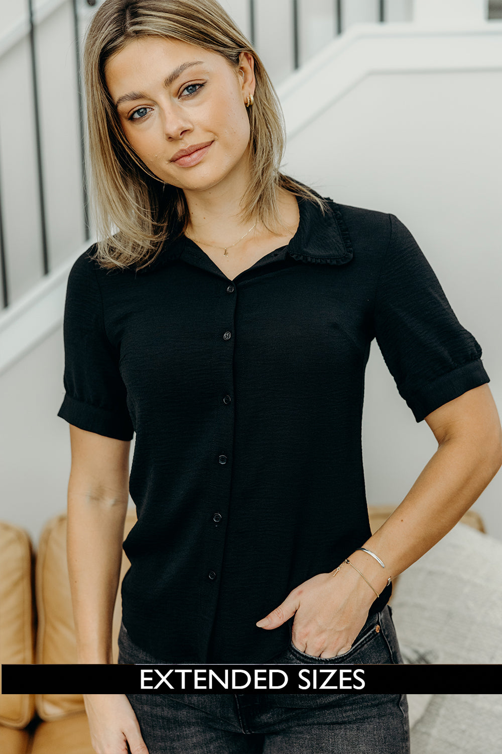 Add a flirty touch with this black button-down blouse, featuring a ruffled collar and breezy short sleeves.