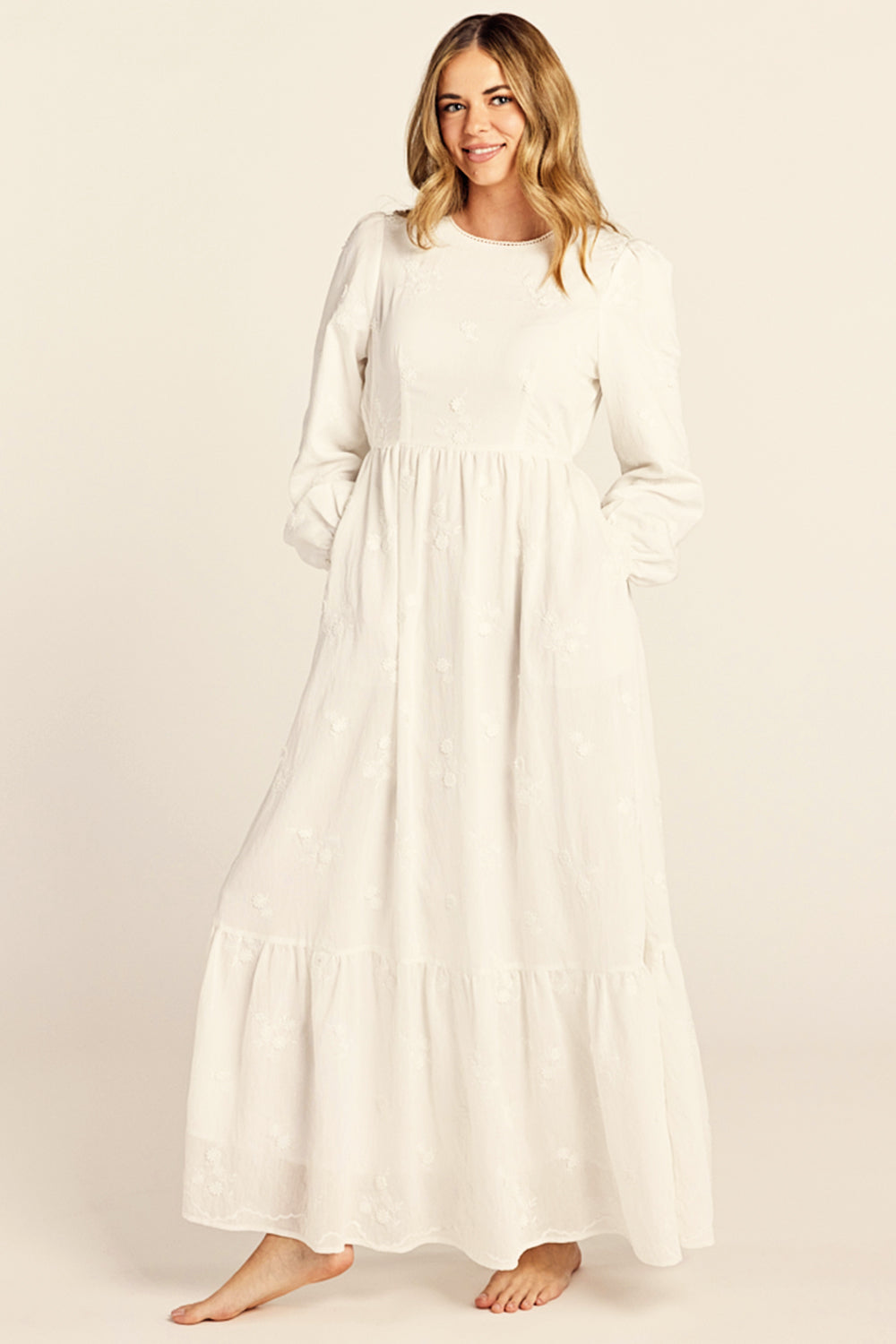 The Acacia Embroidery Floral Temple Dress in Creamy White