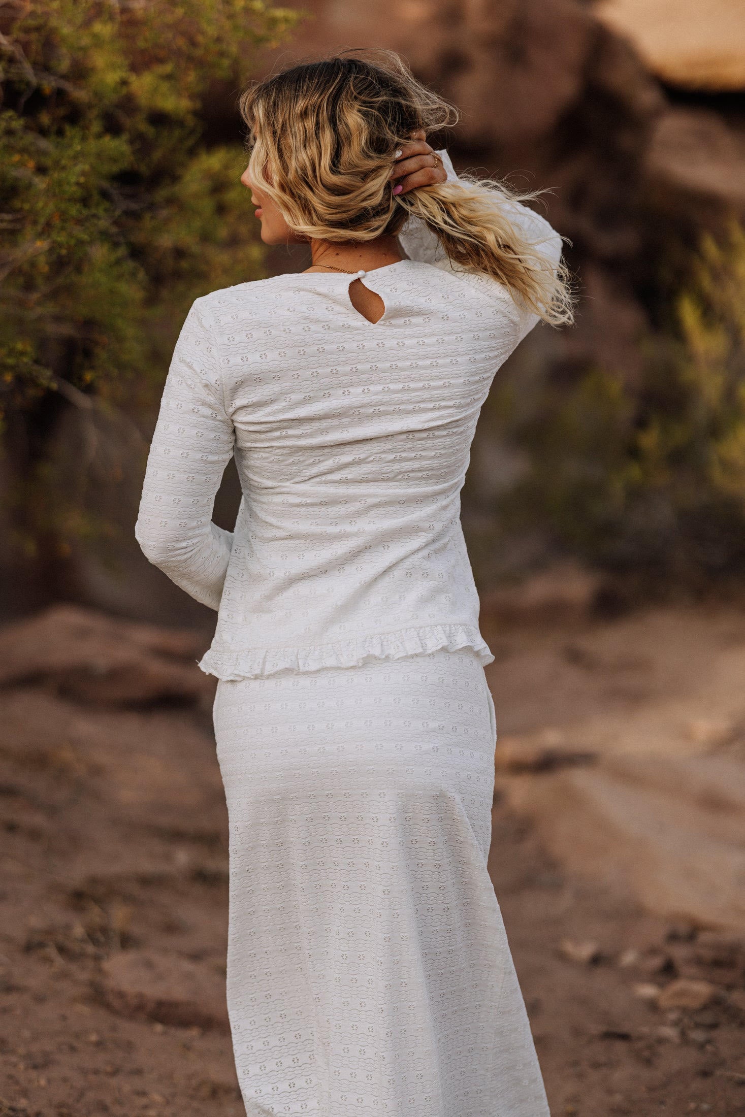 This charming creamy white set features a temple-inspired skirt and top. The top boasts a back button closure with playful ruffles on the sleeves and hem, while the skirt offers an elastic waistband, matching ruffles along the bottom, and handy pockets. Both pieces are fully lined for comfort and style.