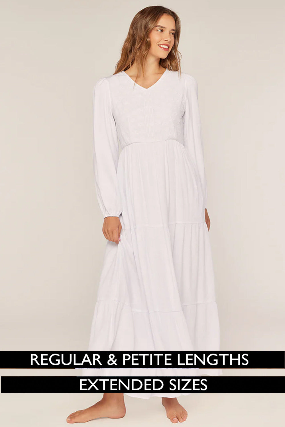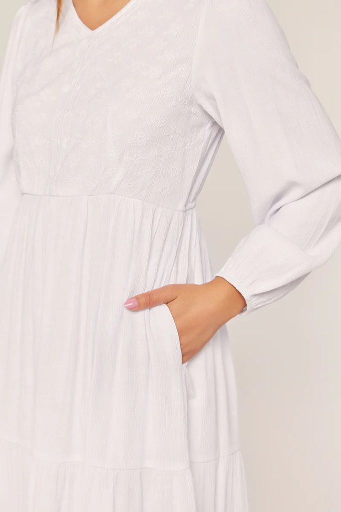 This beautiful white temple dress features a V-neckline and a charming keyhole button closure at the back. Its embroidered bodice adds a delicate touch, while the tiered skirt brings fun movement. Fully lined and equipped with pockets, it’s as practical as it is pretty.