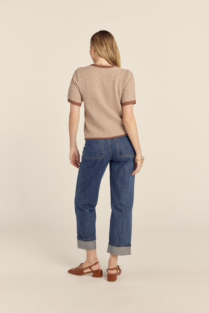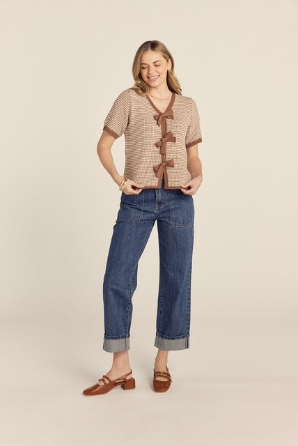 The Darlene Bow Tie Top brings effortless elegance to your everyday wardrobe. This charming sweater top features a flattering v-neck and short sleeves in a sophisticated brown and white colorway. The standout three-tie bow closure at the front adds a playful, feminine touch that elevates any outfit. Perfect for layering or wearing solo, this versatile piece transitions seamlessly from casual days to dressed-up occasions.